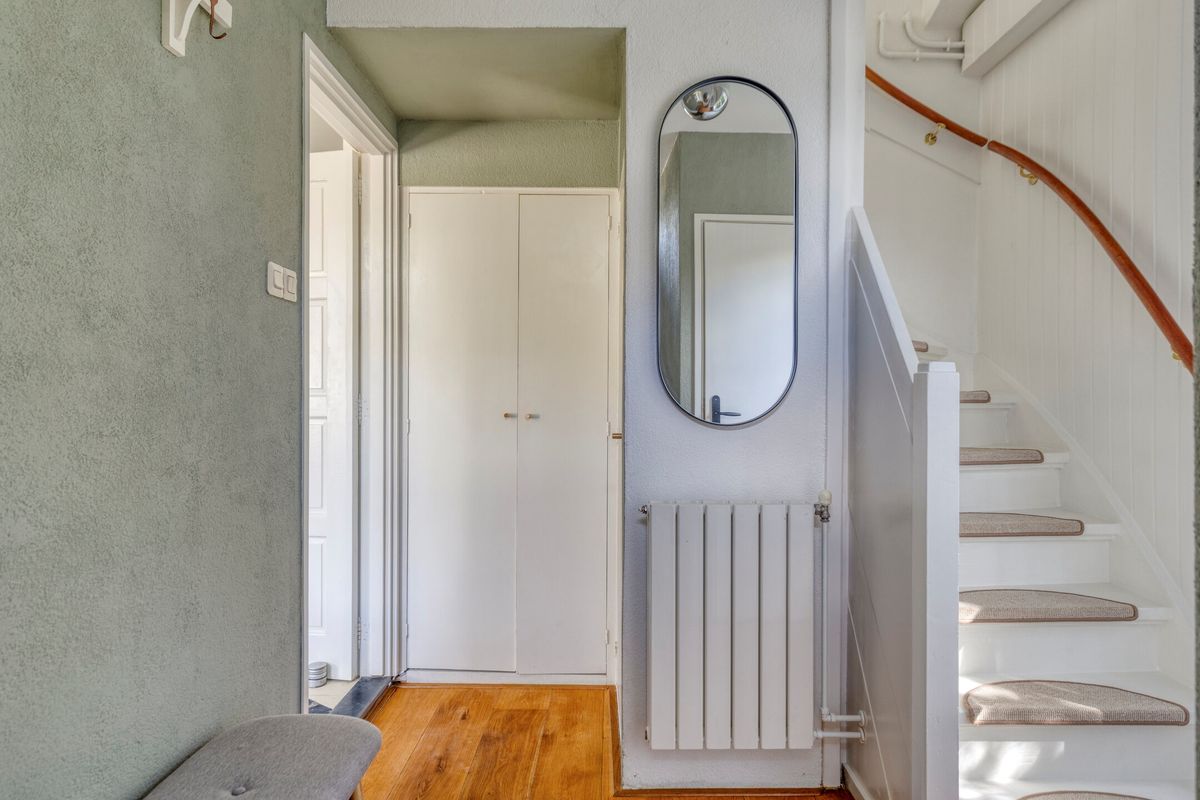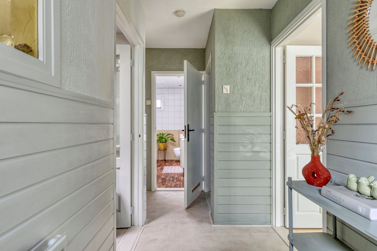 Overloop met aansluitend een riante kamer met diverse bergruimtes onder het dak. Deze kamer kan fungeren als tweede slaapkamer, maar bijvoorbeeld ook als thuiswerk- of praktijkkamer.