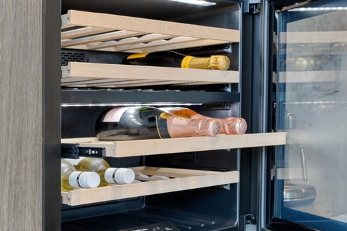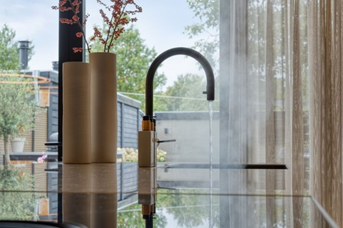De woonkamer aan de voorzijde is royaal opgezet met brede raampartijen, strakke wanden en subtiele inbouwspots die het licht prachtig verdelen. Hier heerst rust, ruimte en verfijning. Aan de achterzijde vormt de maatwerkkeuken het stijlvolle hart van de woning – uitgevoerd in donkere houttinten met een natuurstenen blad en voorzien van topapparatuur, van Siemens, zoals een, combi-oven, wijnklimaatkast, vaatwasser, koel-/vriescombinatie, Quooker en een Bora inductiekookplaat met geïntegreerde afzuiging. Dankzij de brede pui met openslaande deuren naar het terras vloeien binnen en buiten moeiteloos in elkaar over. Het resultaat is een leefruimte waar design en dagelijks comfort elkaar versterken – een fijne plek voor gezellige diners, lange avonden met familie en vrienden.