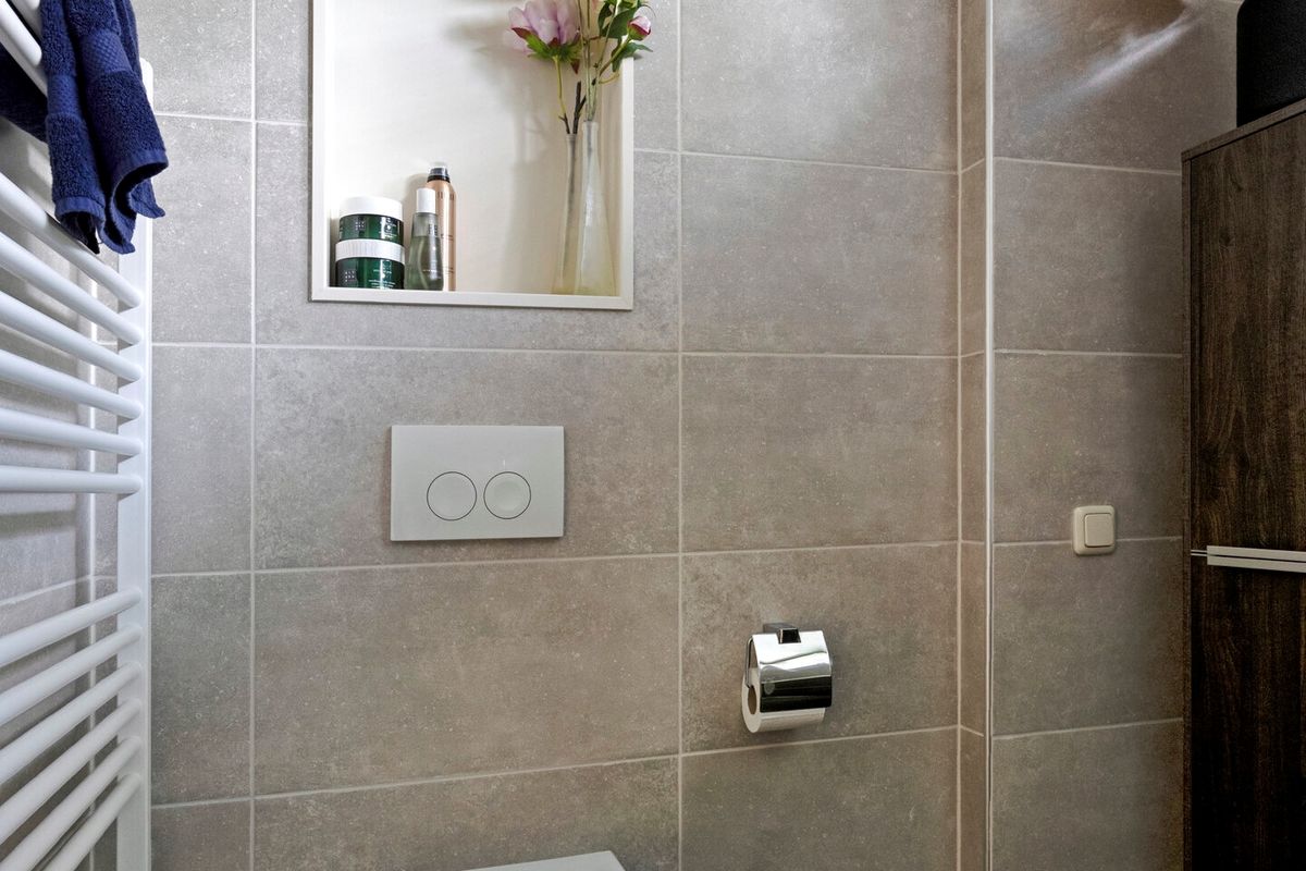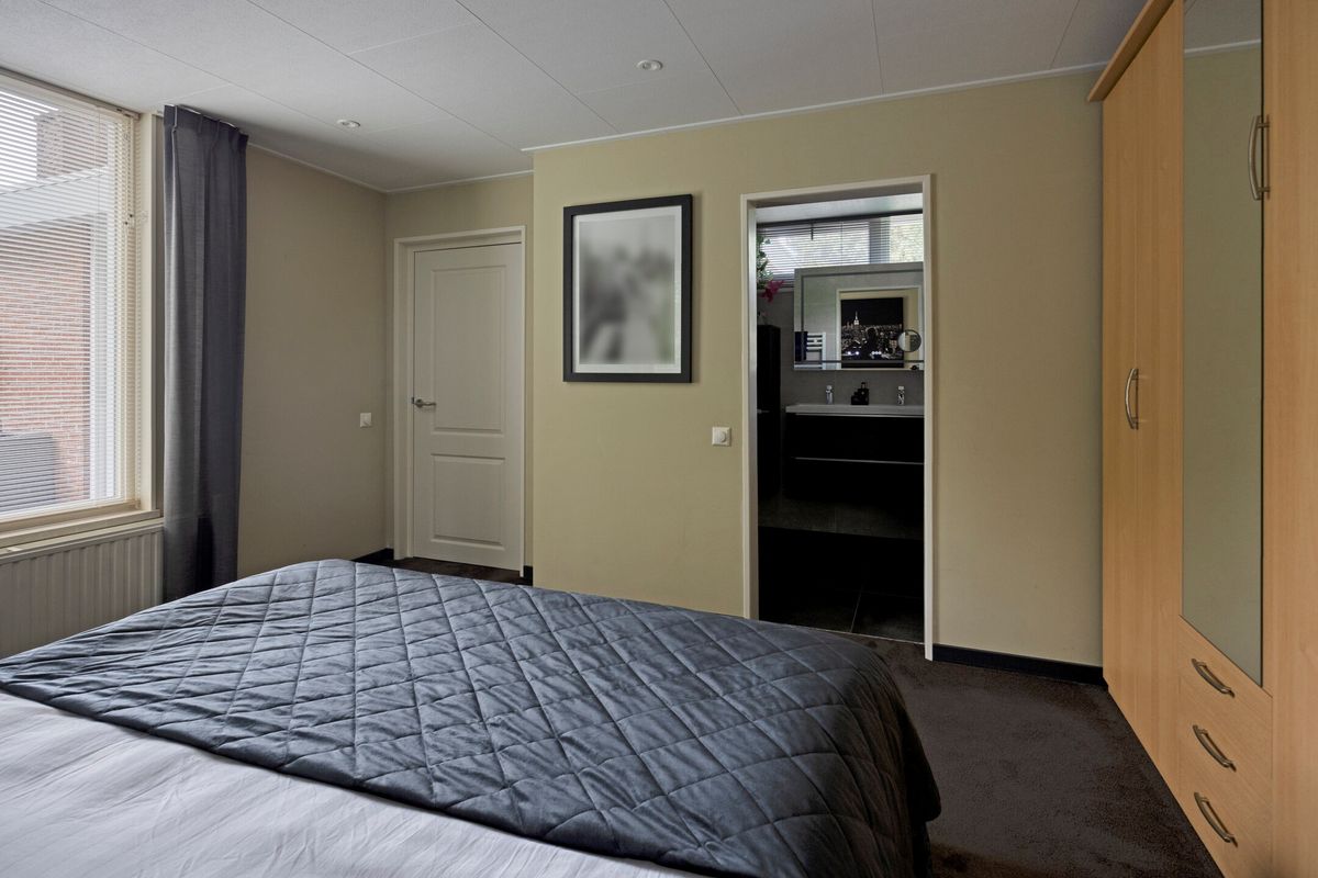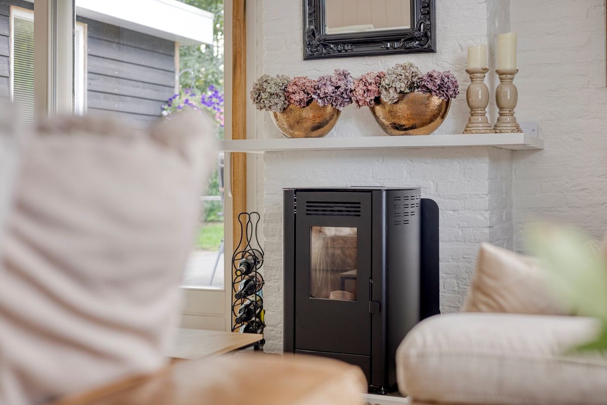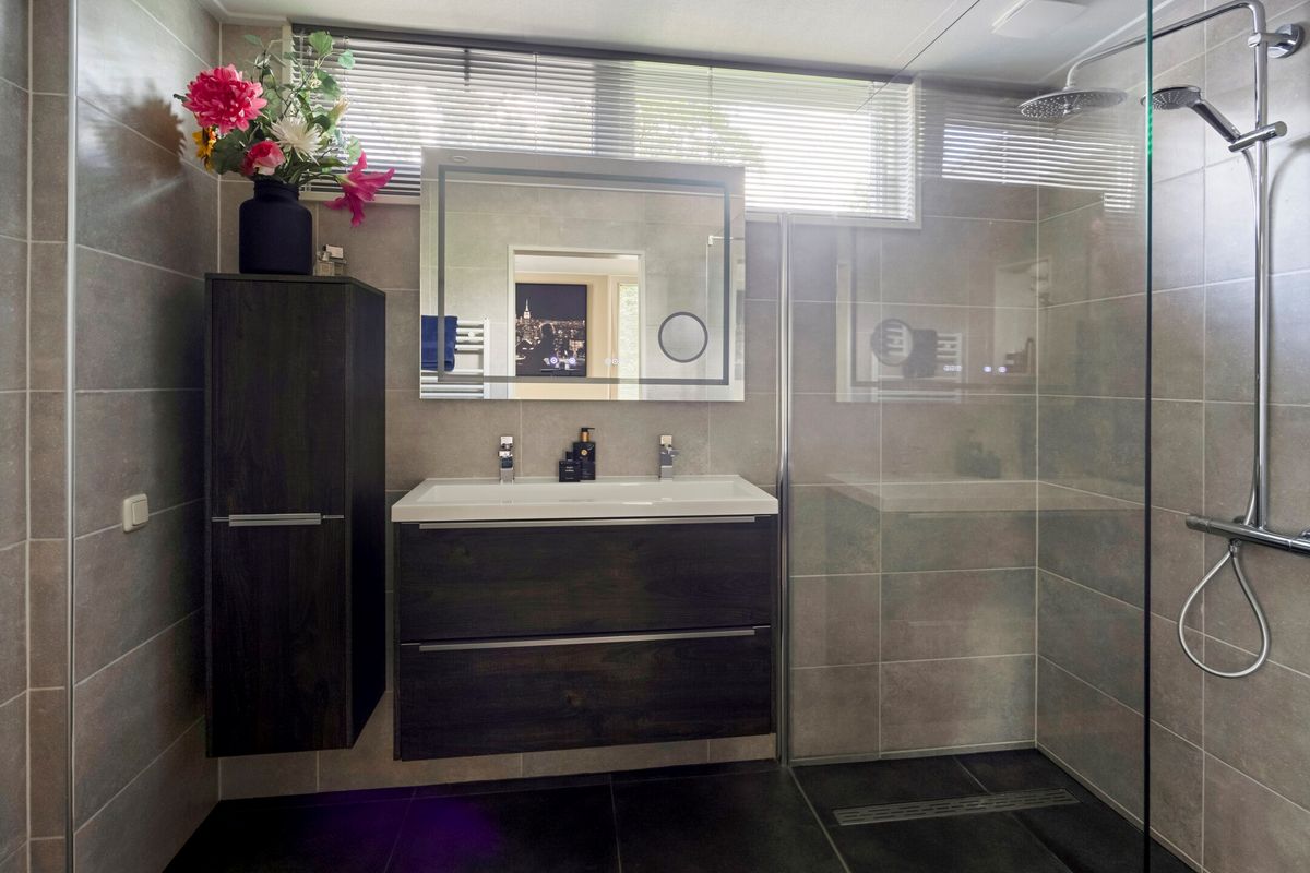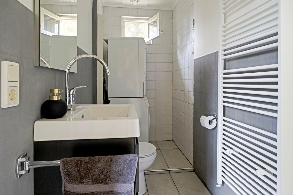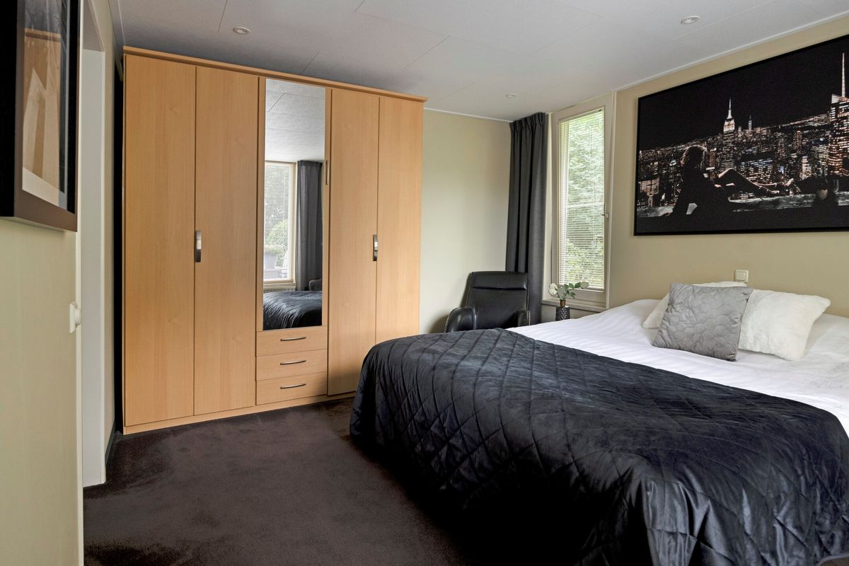 Entree / hal met trapopgang, berging/bijkeuken, slaapkamer en een toiletruimte voorzien van een toilet, wastafel en opstelplaats voor wasmachine en droger. De beschikt over veel lichtinval, een schuifpui en een pellet kachel (ter overname). De keuken is voorzien van een L-vormig keukenblok met diverse inbouwapparatuur, o.a. een gaskookplaat, afzuigkap, vaatwasser, koelkast en een combimagnetron. De tweede slaapkamer, bereikbaar via de woonkamer beschikt over een badkamer voorzien van een douchehoek, toilet en een dubbele wastafel in meubel.