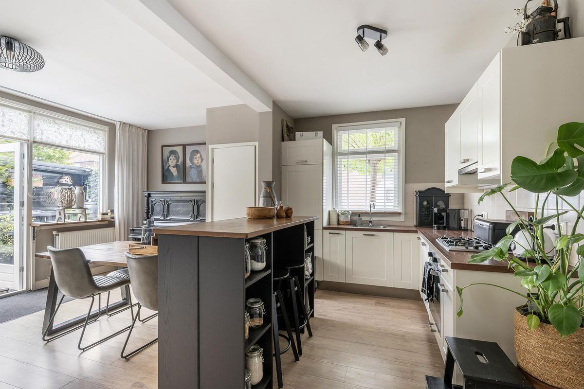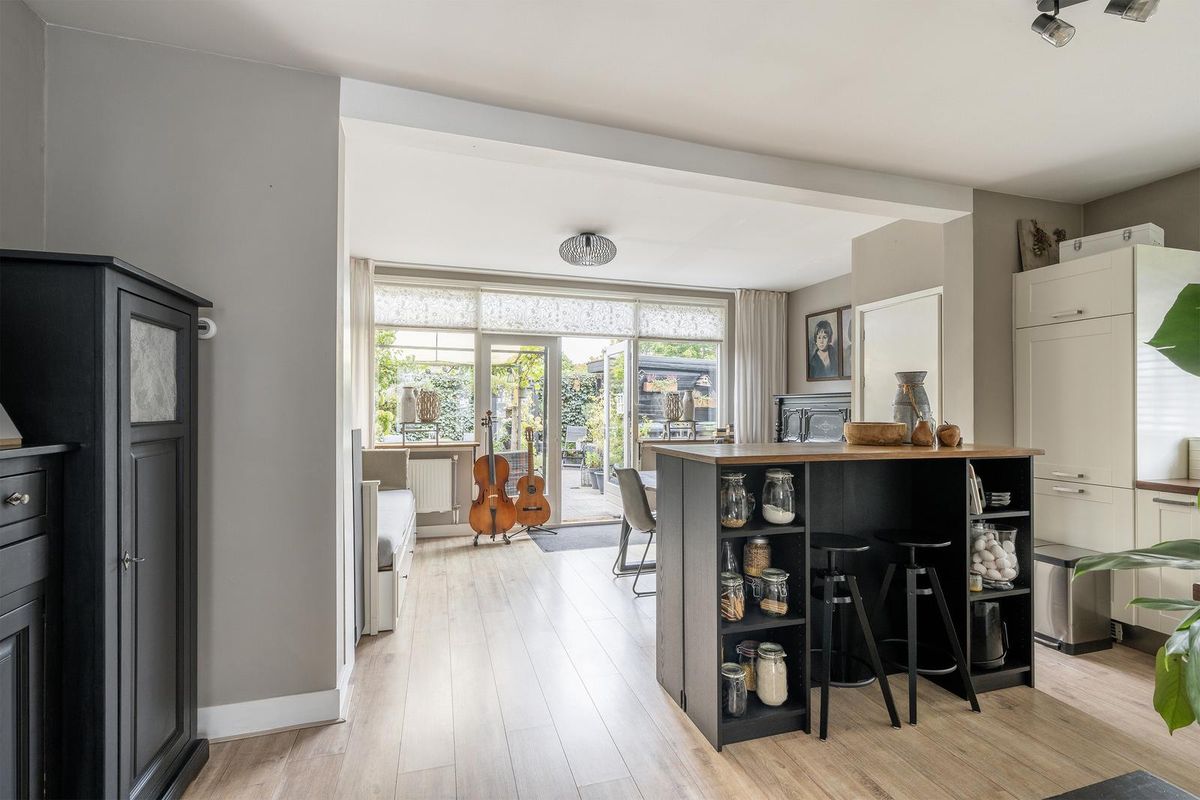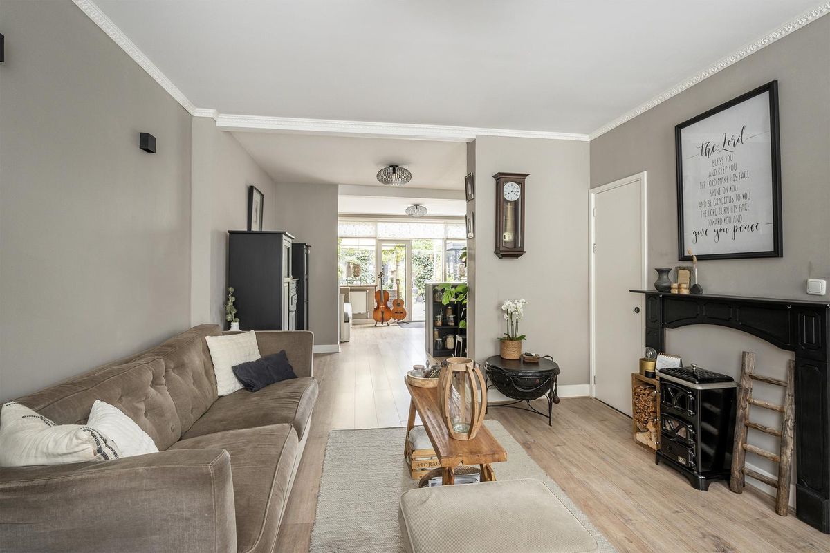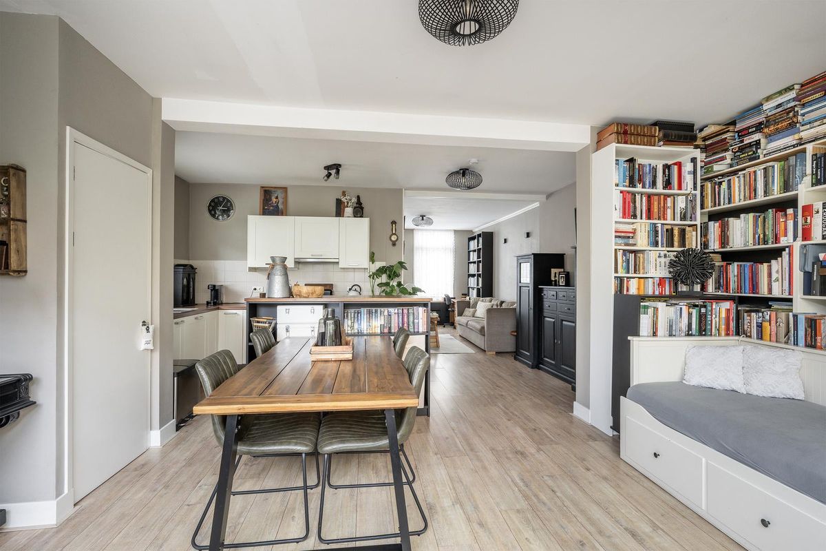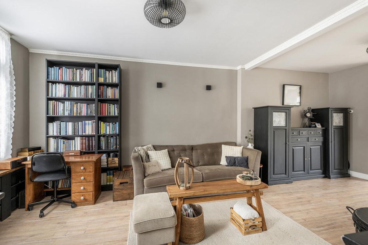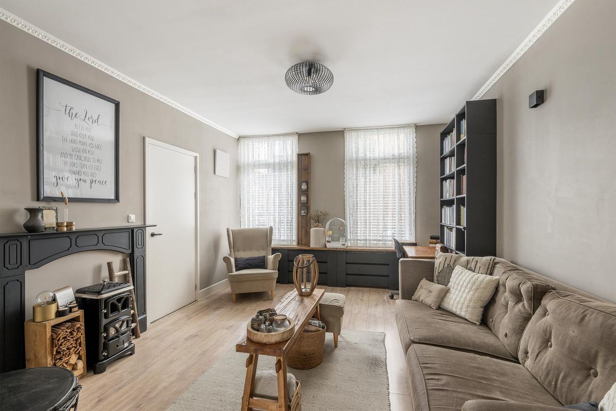 Sfeervolle zithoek aan de straatzijde met authentieke luiken voor de ramen, sierschouw, trapkast en een doorloop naar de woonkeuken.