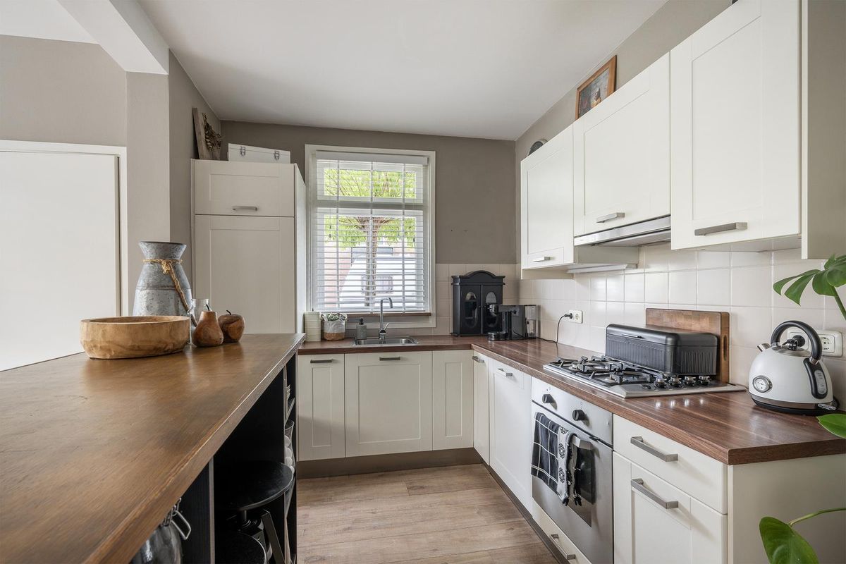 De keuken is in hoekopstelling geplaatst met een 4-pits gaskookplaat, recirculatiekap, oven, koel-vriescombinatie, spoelbak en een ontbijtbar.