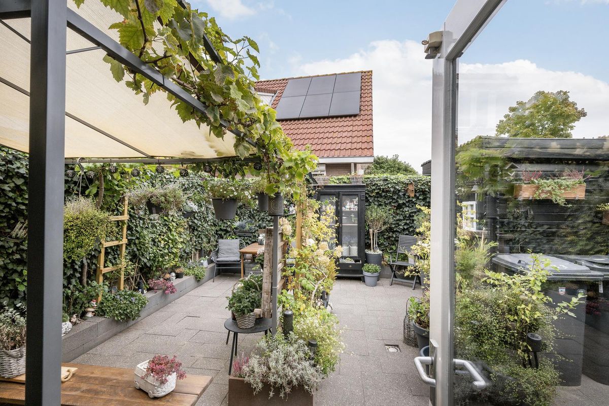 De achtertuin ligt op het noordoosten en beschikt over sierbestrating, plantenborders, achterom, buitenkraan, elektra, een houten berging (circa 1.76 bij 1.78 m) en een overkapping voor de fietsen.