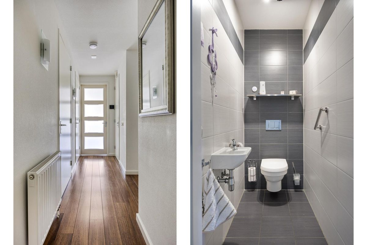Het toilet is afgewerkt met een tegelvloer, tegels als wandafwerking en spuitwerk als plafondafwerking en is voorzien van een hangend closet en een fonteintje.