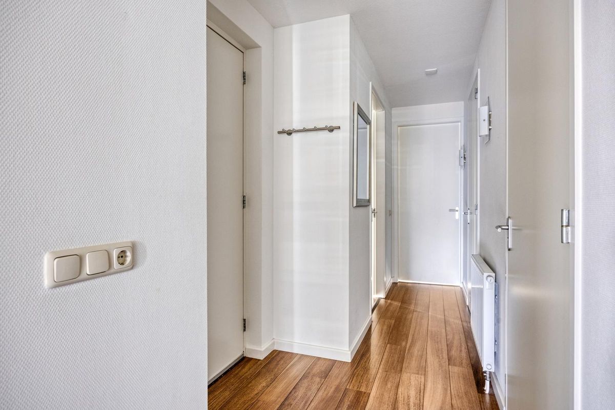 De entree is afgewerkt met een laminaatvloer, vliesbehang als afwerking en spuitwerk als plafondafwerking. De entree geeft toegang tot de meterkast (9x 220V automaat + 2 aardlekschakelaars), de woonkamer met open keuken, de technische ruimte, het toilet, de badkamer en de twee slaapkamers.