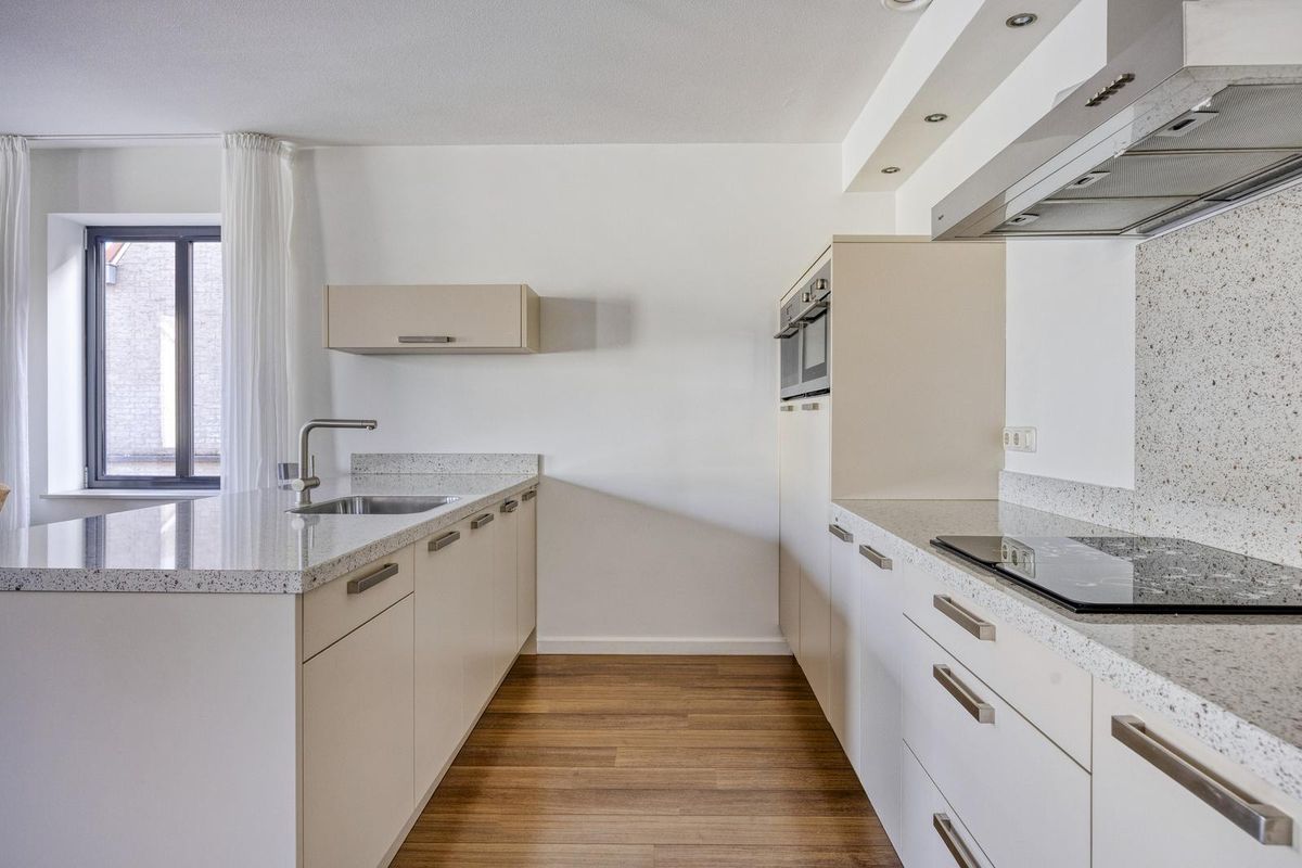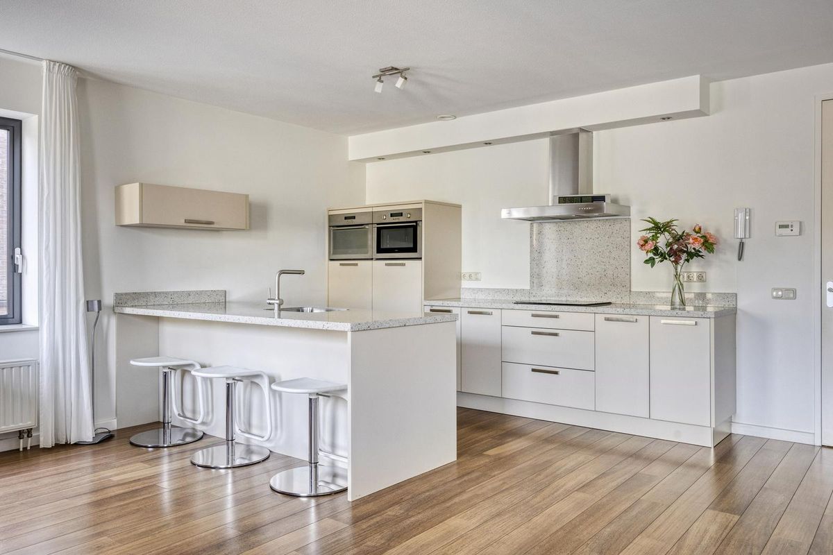 De keuken met schiereiland en bar is voorzien van een composieten aanrechtblad en inbouwapparatuur, te weten: een inductiekookplaat, afzuigkap (Pelgrim), een combimagnetron-stoomoven (Pelgrim) een vaatwasser, een koelkast en vriezer met 4-lades en een gootsteen.