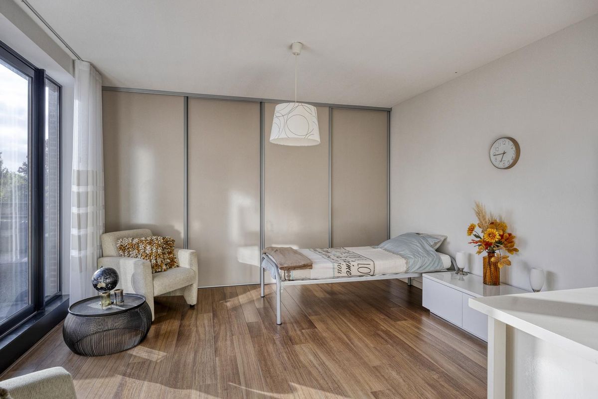 De slaapkamer is afgewerkt met een laminaatvloer, stucwerk als wandafwerking en spuitwerk als plafondafwerking.