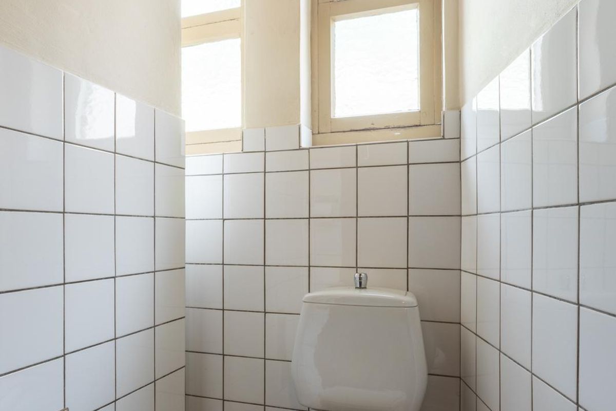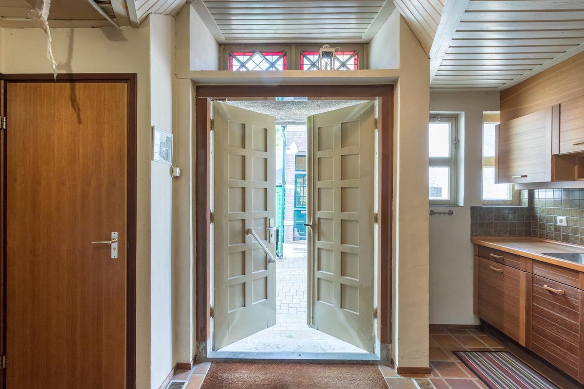 Via de dubbele deuren betreed je de hal, die toegang biedt tot de trapopgang, meterkast, toilet, keuken en de ruime woonkamer. De hal is afgewerkt met een plavuizenvloer en sluit mooi aan bij de authentieke stijl van het pand.
