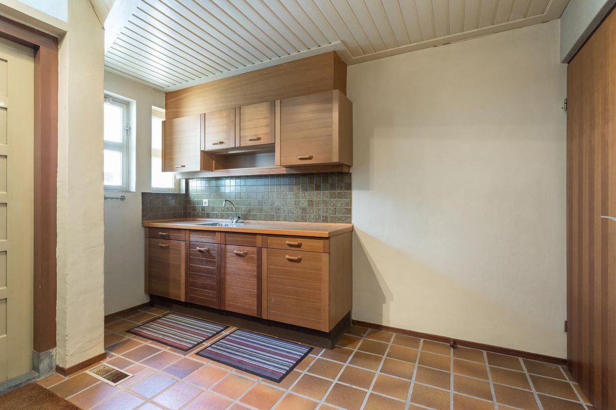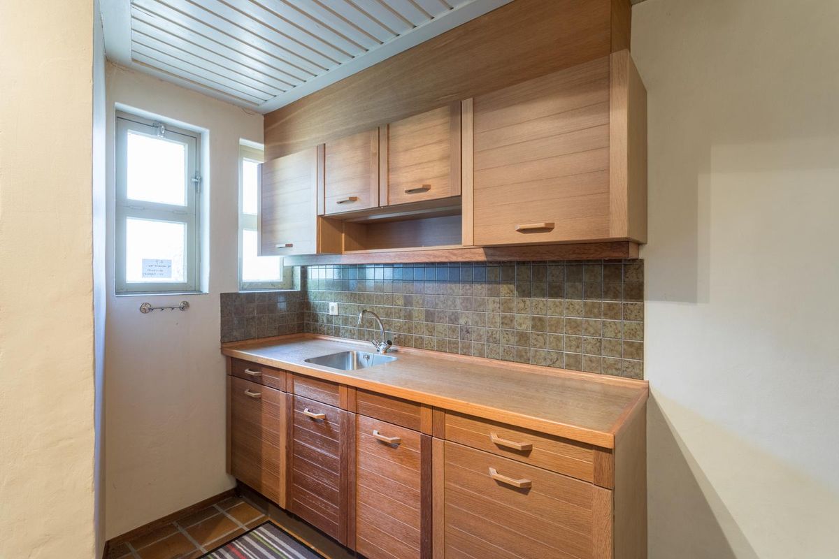 De keuken heeft een eenvoudige, eiken inrichting en biedt volop mogelijkheden om naar eigen wens te moderniseren. De ruimte van hal en keuken samen bedraagt circa 3.60 x 4.78 meter.