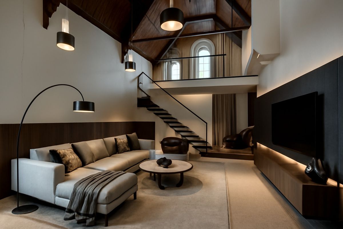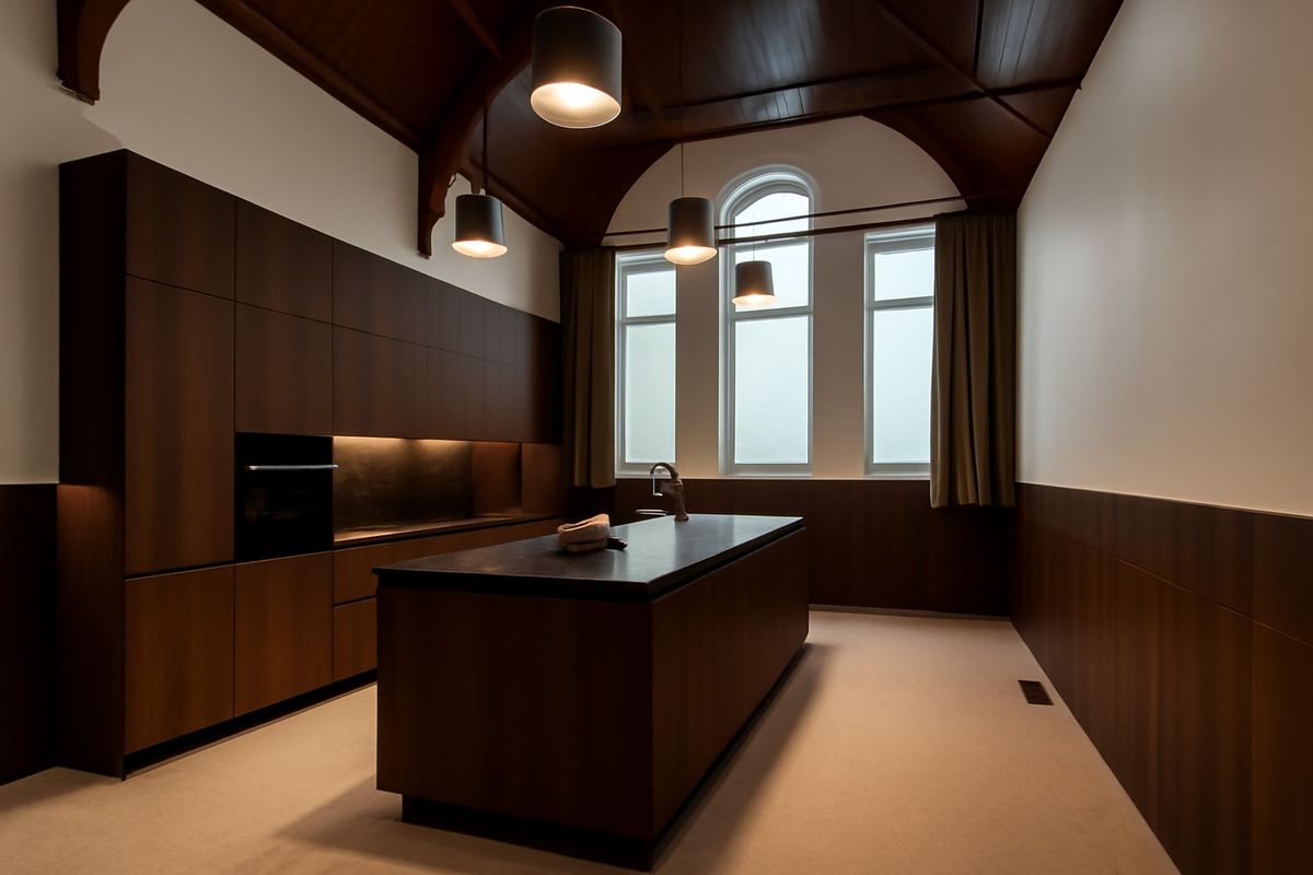 De woonkamer is royaal van formaat en hier is ruimte voor de toekomstige keuken, circa 10 meter diep en 4.80 meter breed en is open tot aan de nok. De hoge plafonds, grote raampartijen en de vrije ligging zorgen voor een bijzonder ruimtelijk gevoel en veel natuurlijk licht. Aan de zijkant bevindt zich een deur naar de parkeerplaats, en aan de achterzijde ligt een kleine buitenruimte van circa 2.50 x 5.00 meter, ideaal voor een zitje of compacte stadstuin of berging.