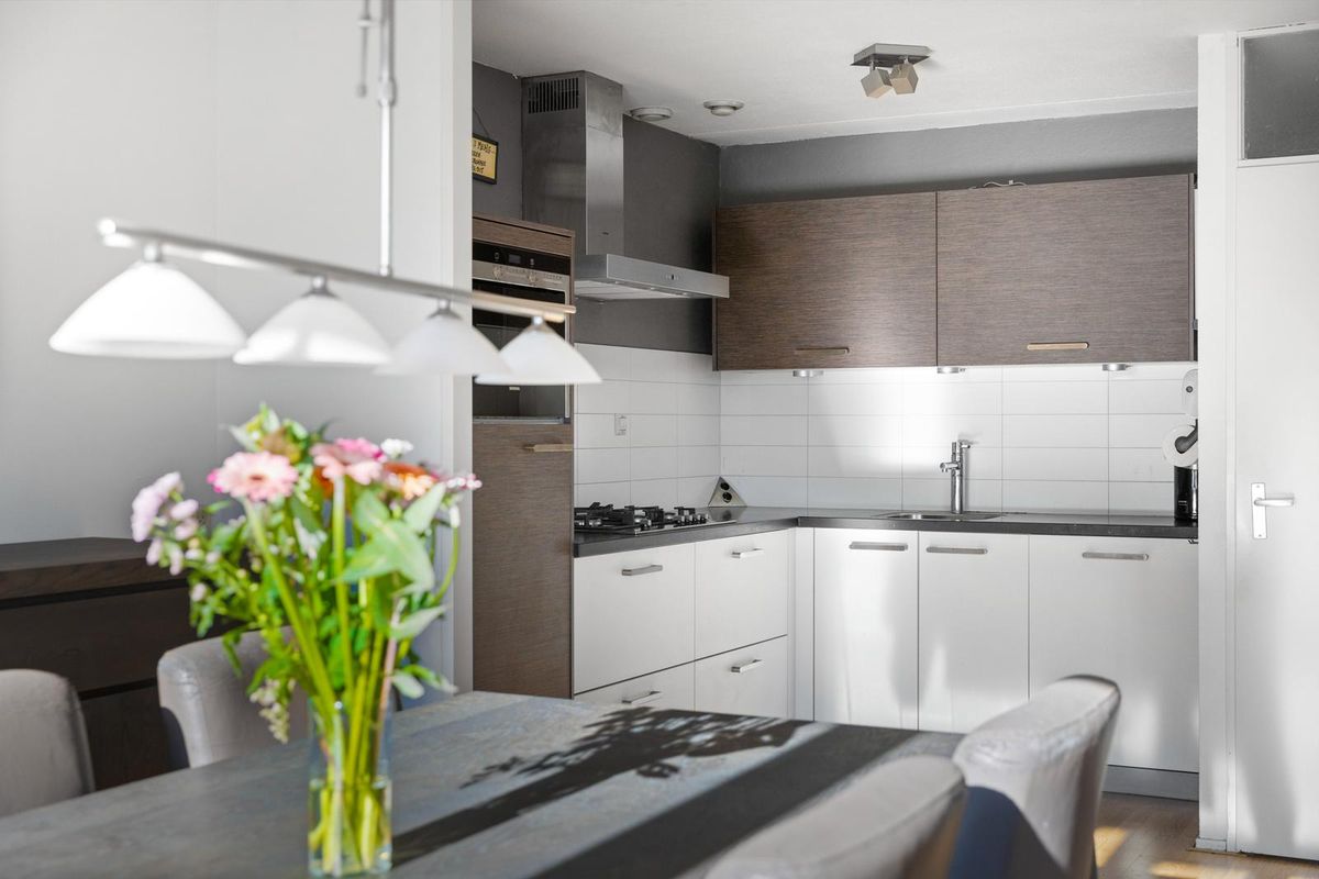 Via de hal loop je de lichte en ruime woonkamer in, waar het daglicht je direct tegemoet komt door de vele ramen aan de achterzijde. De living biedt volop ruimte om een gezellige zithoek te creëren én een grote eettafel neer te zetten waar je heerlijk kunt tafelen met familie en vrienden. Vanuit de open keuken houd je fijn contact met je gasten terwijl je kookt. De hoekkeuken is voorzien van diverse inbouwapparatuur, zoals een koelkast, combi-oven, gasfornuis met afzuigkap en een vaatwasser. Daarnaast is er voldoende kastruimte om al je keukenspullen netjes op te bergen. In de hal vind je verder het toilet en de meterkast.