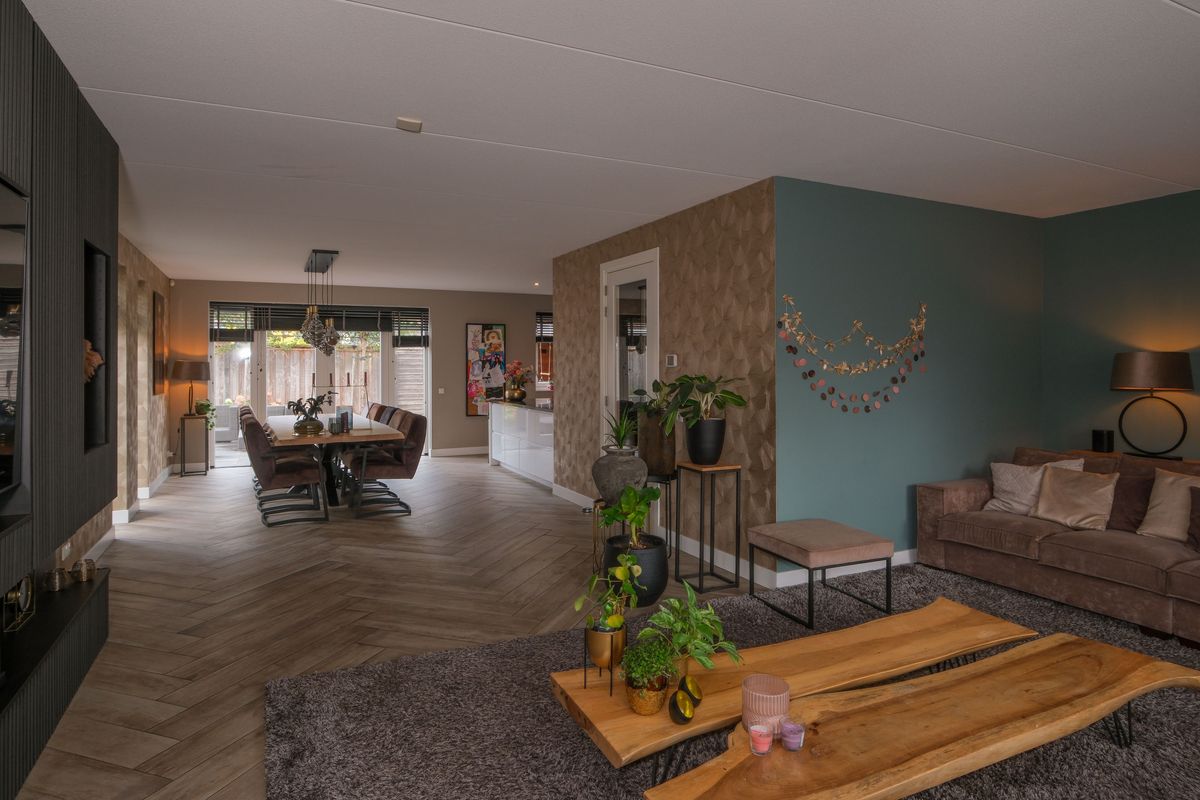 Binnen kom je in een open living die klopt als een huis: wonen, eten en koken vloeien naadloos in elkaar over. De erker vangt het licht, de cinewall voegt sfeer en stijl toe, de keramische visgraatvloer met vloerverwarming zorgt voor dat heerlijke, constante comfort. Met beneden-afmetingen van circa 12,30 × 6,90 m en een uitbouw aan de achterzijde voelt alles royaal en vrij.