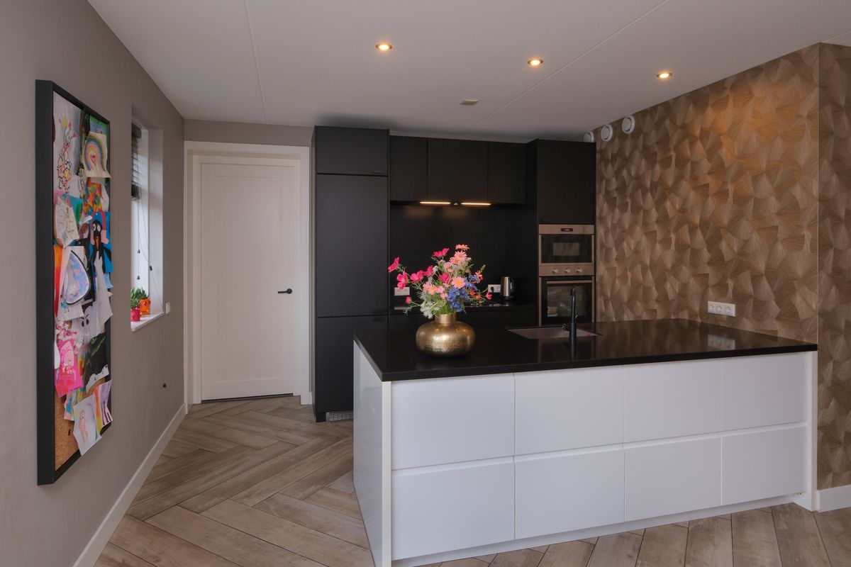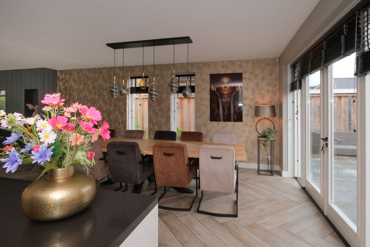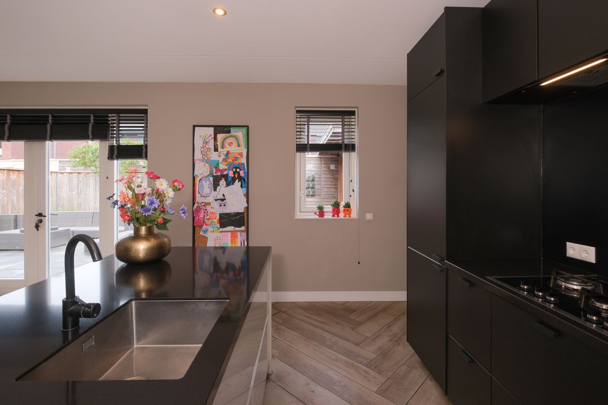 De leefkeuken met eiland is het hart van het huis. Koken, kletsen, helpen met huiswerk, het gebeurt en kan hier moeiteloos tegelijk. De openslaande tuindeuren betrekken buiten naar binnen: een groot zonneterras, sierbestrating met groene accenten en een overkapping waar lange avonden een gewoonte worden. En praktisch is het binnen ook: inpandig vanuit de keuken loop je zó de garage/berging in, fietsen, voorraad, groot speelgoed; allemaal uit zicht en toch dichtbij.