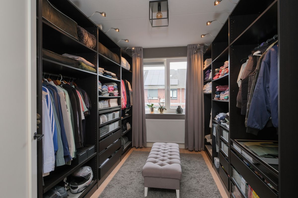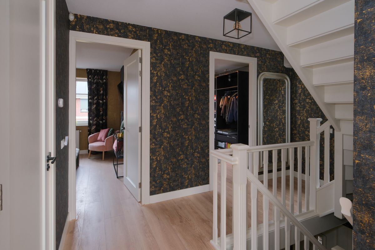 Boven voelt het rustig. Drie slaapkamers én een briljante kleedkamer maken het dagelijks leven comfortabel; de strakke laminaatvloeren dragen bij aan de rustige look. De badkamer is een weldaad met dubbele waskommen, ligbad, duo-douche en vloerverwarming.