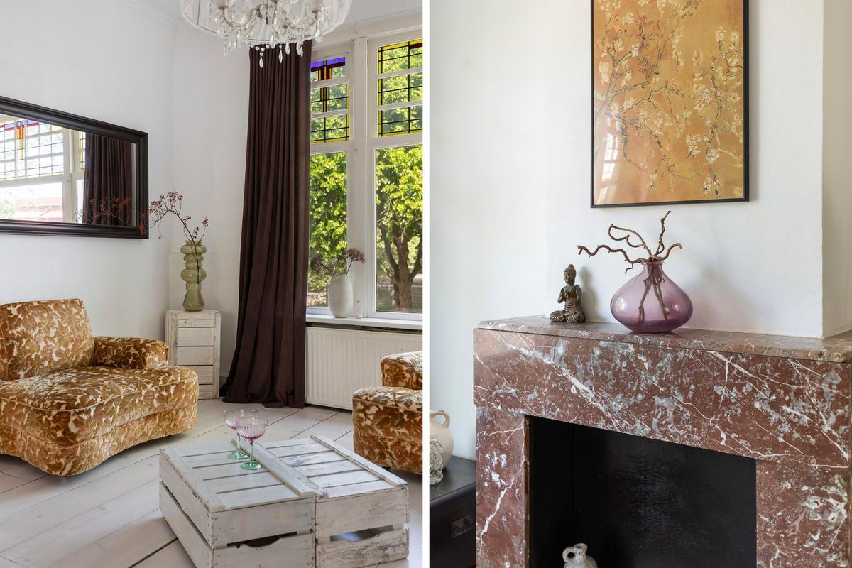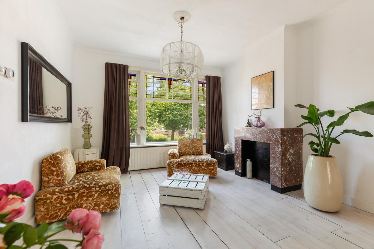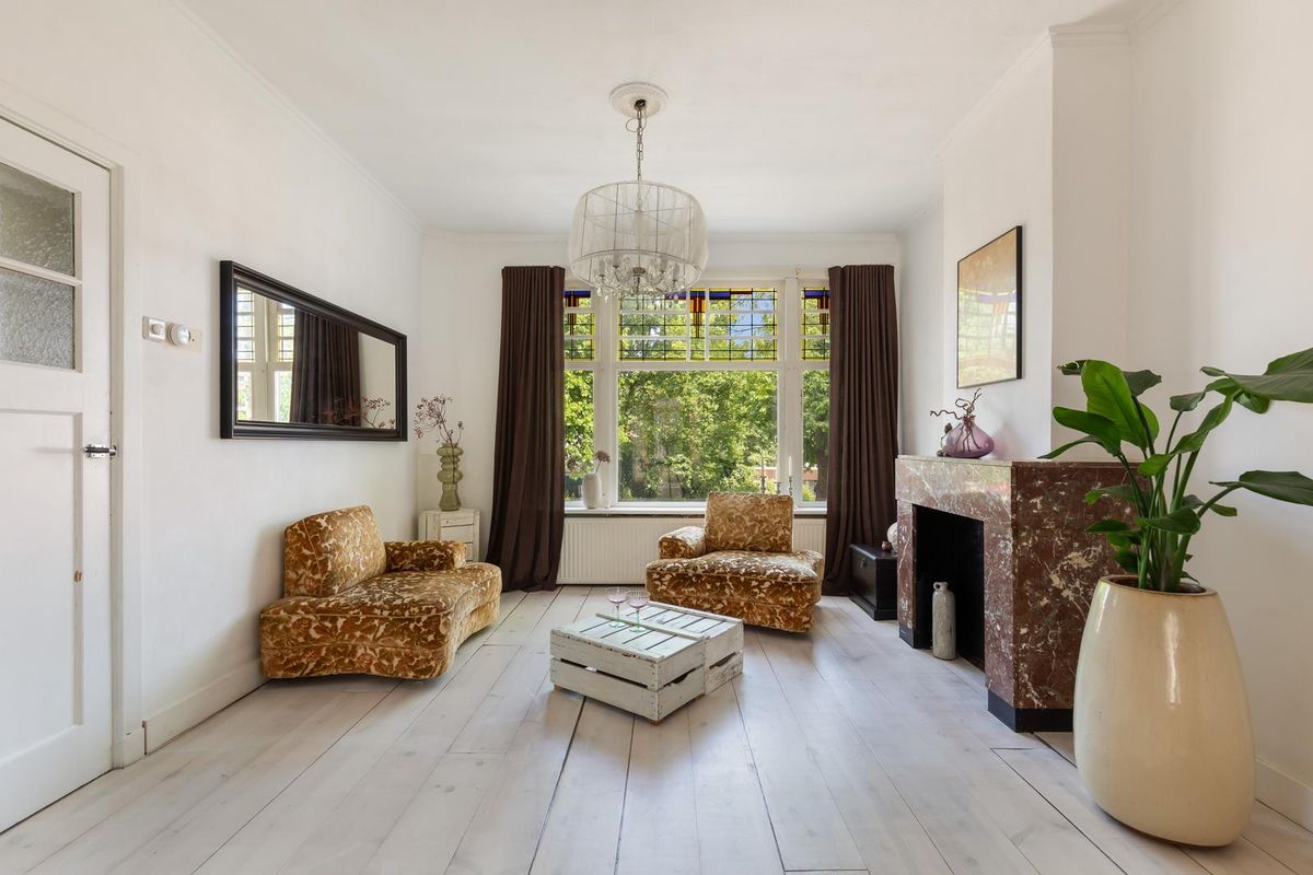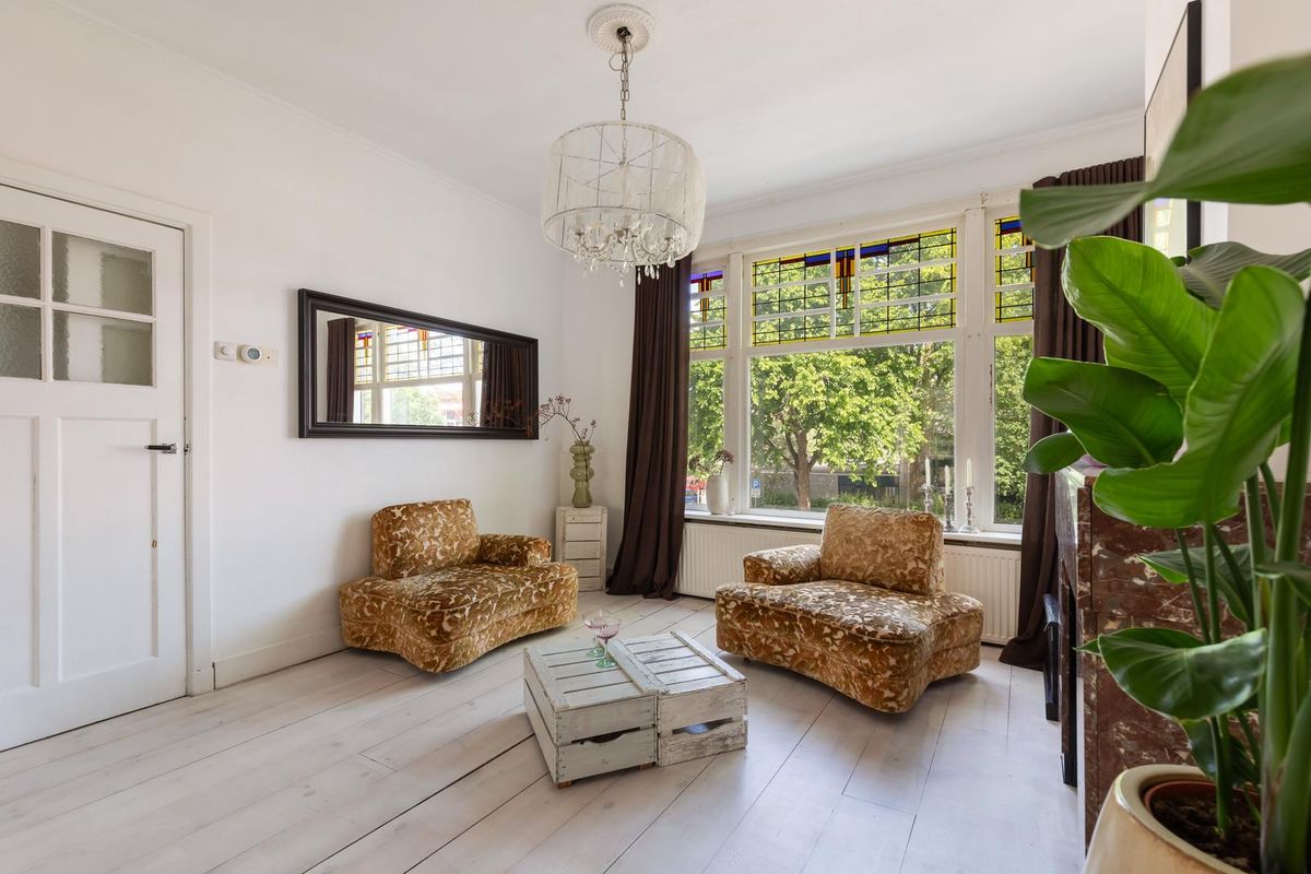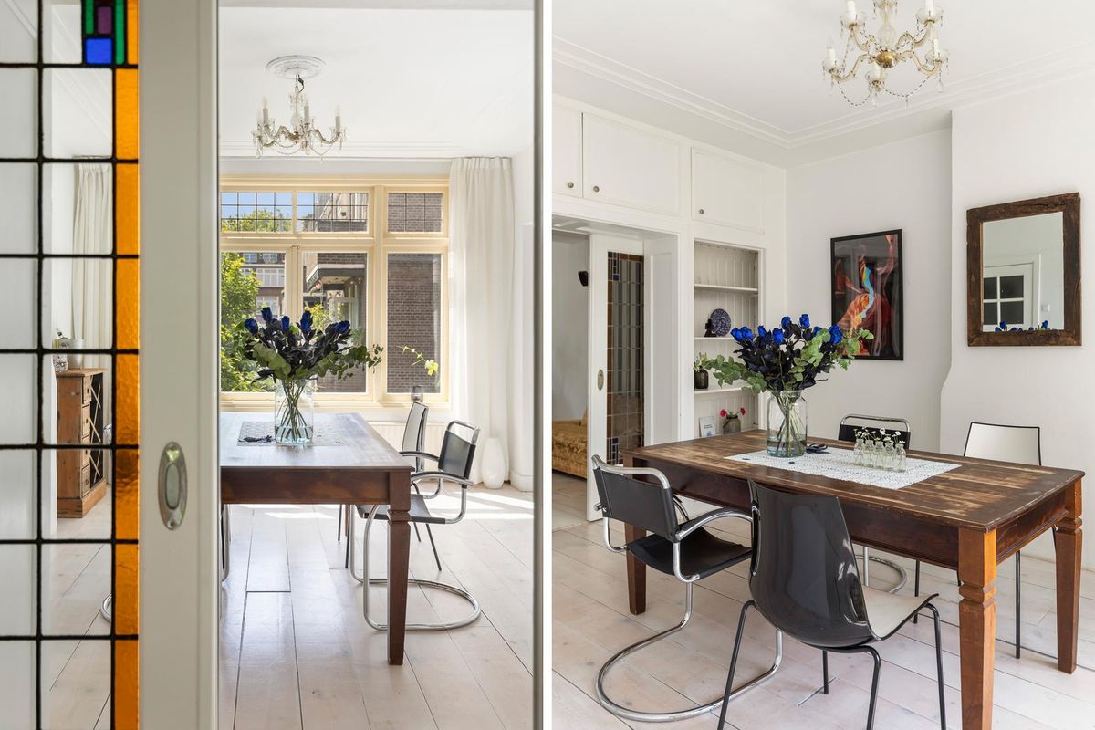 Ruime hal/entree met vaste kast (met wasmachine-aansluiting), separaat toilet en toegang tot alle vertrekken op deze verdieping. Direct valt het oog op de karakteristieke ornamenten, paneeldeuren, schouw en de glas-in-lood ramen & schuifdeuren uit de jaren ’30. Door de grote raampartijen aan beide zijde van de woning treedt er veel natuurlijk licht de woning binnen, wat zorgt voor een fijne, lichte sfeer. De royale woonkamer en suite is erg ruim te noemen en is gelegen aan de voorzijde van de woning. Er is meer dan voldoende ruimte om een riante zitgedeelte te creëren. Middels de karakteristieke en-suite schuifdeuren bereik je het eetgedeelte. Dankzij de half open keuken is dit de ideale plek om uitgebreid te dineren met gezelschap, terwijl je gezellig in contact blijft met elkaar. De keuken beschikt over diverse inbouwapparatuur zoals een 4-pits gasfornuis met afzuigkap, oven, vaatwasser en een koel-/vriescombinatie. Middels een deur gelegen in de keuken bereik je het 1e balkon gelegen op het zuidwesten. Hier kan je gedurende de dag heerlijk van de zon genieten! De 1e slaapkamer is gelegen aan de voorzijde. Deze slaapkamer is multifunctioneel in te richten als bijvoorbeeld een slaap-, kinder- of werkkamer.