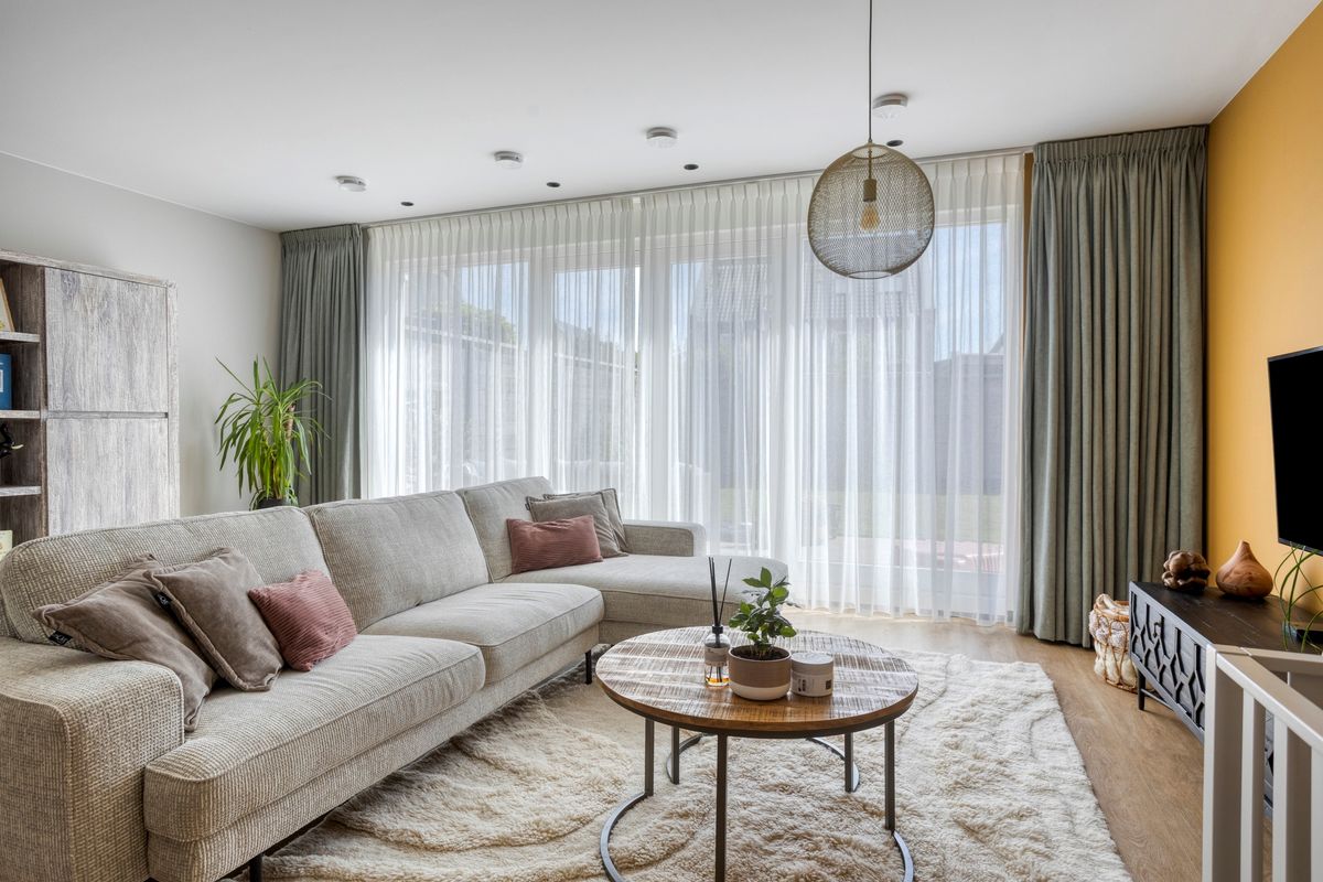 Vanuit de hal/entree met meterkast is er toegang tot het toilet, de trapopgang naar de eerste verdieping en de woonkamer met open keuken. De keuken is gelegen aan de voorzijde van de woning en is v.v. een wandopstelling en een kookeiland, diverse kasten en lades, een composiet werkblad met spoelbak en kokend waterkraan (Quooker), een inductiekookplaat met afzuiging (Bora), een koelkast (Liebherr), vriezer (Liebherr), vaatwasser (Siemens) en een combi stoomoven (Siemens). Het woongedeelte is aan de achterzijde van de woning gelegen en middels tuindeuren is de ruime achtertuin bereikbaar. De grote raampartijen zorgen voor een prettig zicht op de achtertuin. In de woonkamer is een trapkast aanwezig wat zorgt voor extra bergruimte. De vloer van de gehele begane grond is v.v. pvc met vloerverwarming en vloerkoeling. De wanden en plafonds zijn afgewerkt met stucwerk. De kozijnen zijn van hout met HR++ glas. Het toilet is v.v. een hangend toilet en fonteintje en de wanden zijn v.v. stucwerk.