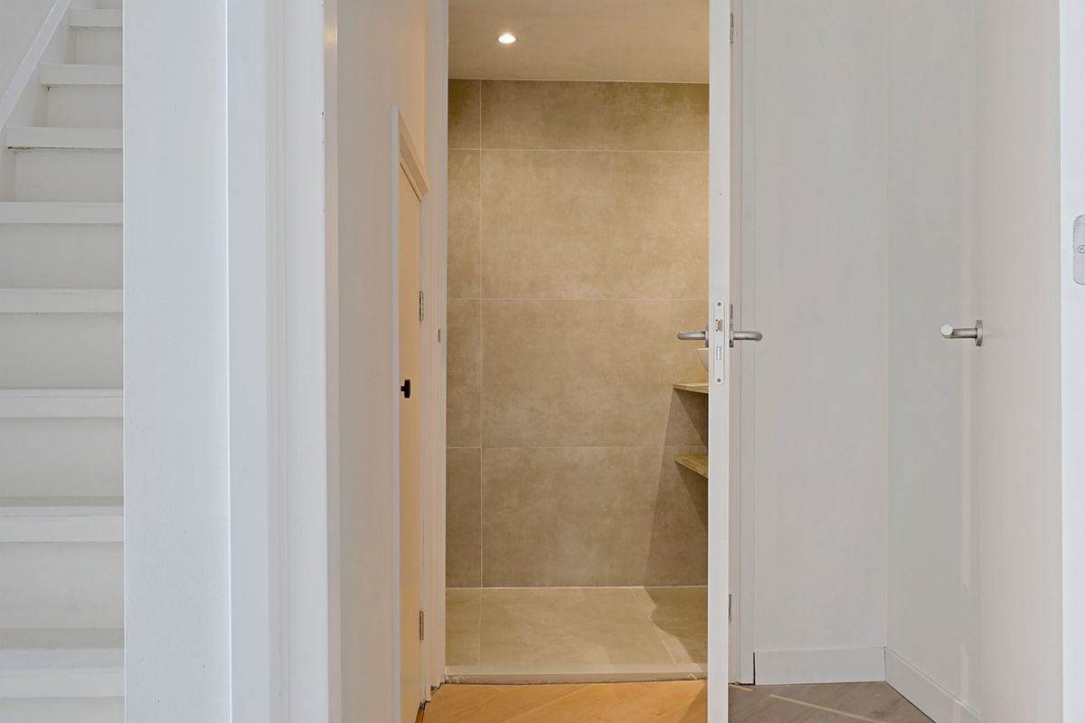 De begane grond is slim opgedeeld in twee delen, door in een tussengedeelte een vaste trap naar de eerste verdieping te realiseren, met onder de trap het moderne toilet met wastafelmeubel. Aan de achterzijde bevindt zich de woonkamer, die extra veel lichtinval heeft door de gerealiseerde lichtstraat. Ook zijn hier recent openslaande deuren naar de achtertuin geplaatst.