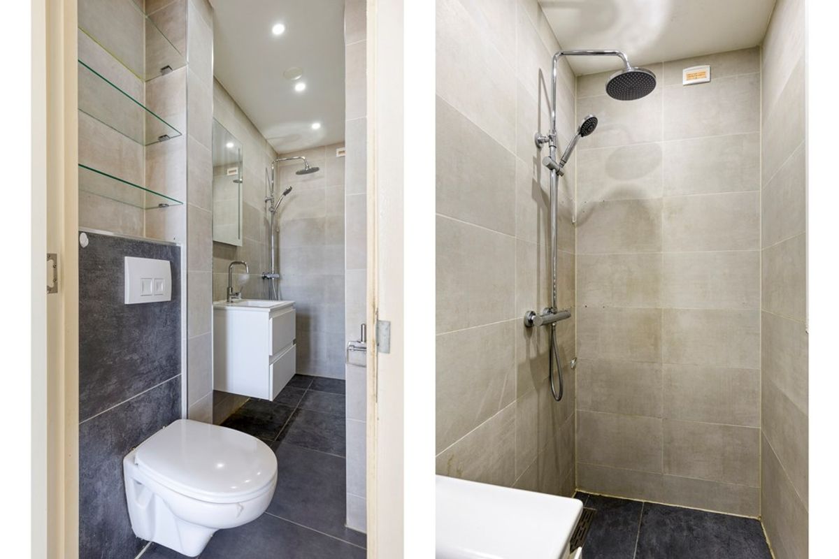 De badkamer is praktisch ingericht en beschikt over een inloopdouche, een modern wastafelmeubel en een wandcloset. Alles wat je nodig hebt is hier aanwezig, afgewerkt in een nette en verzorgde stijl.
