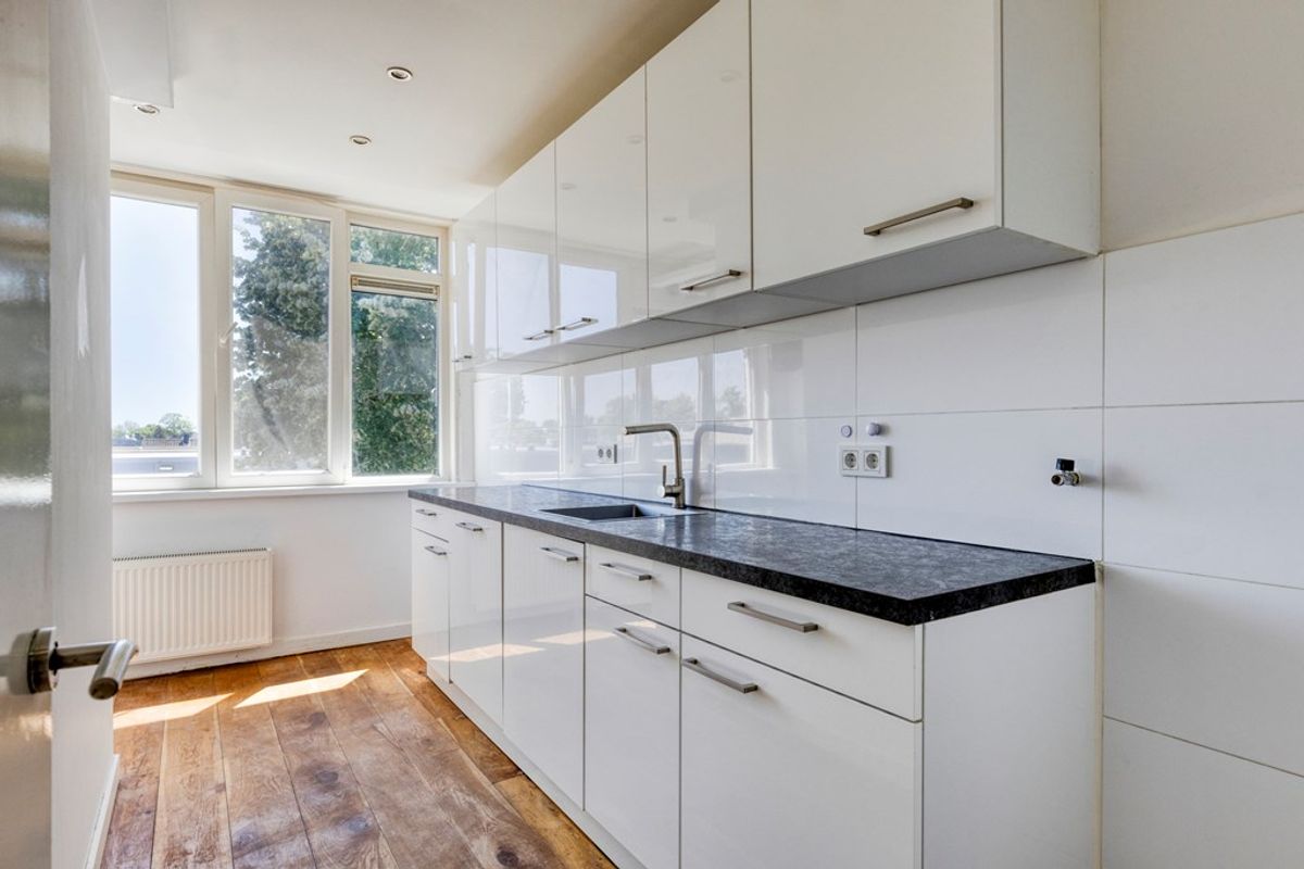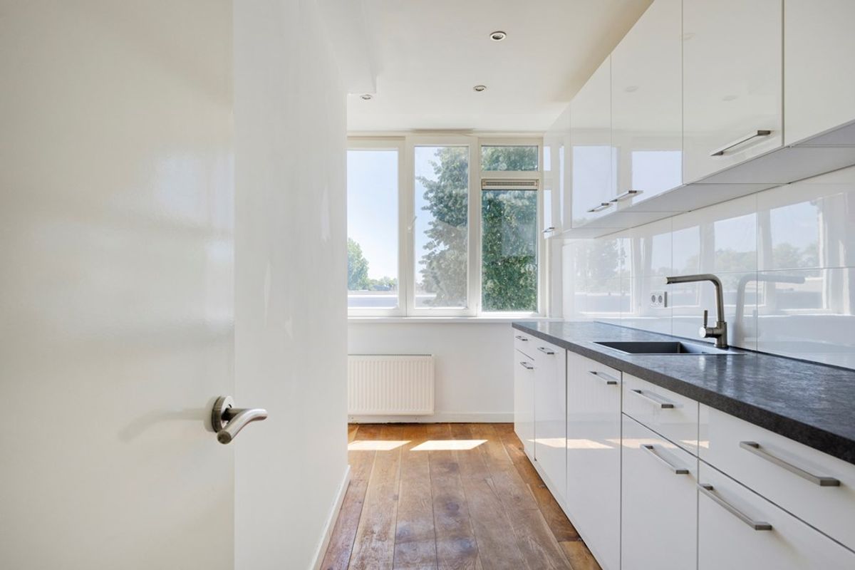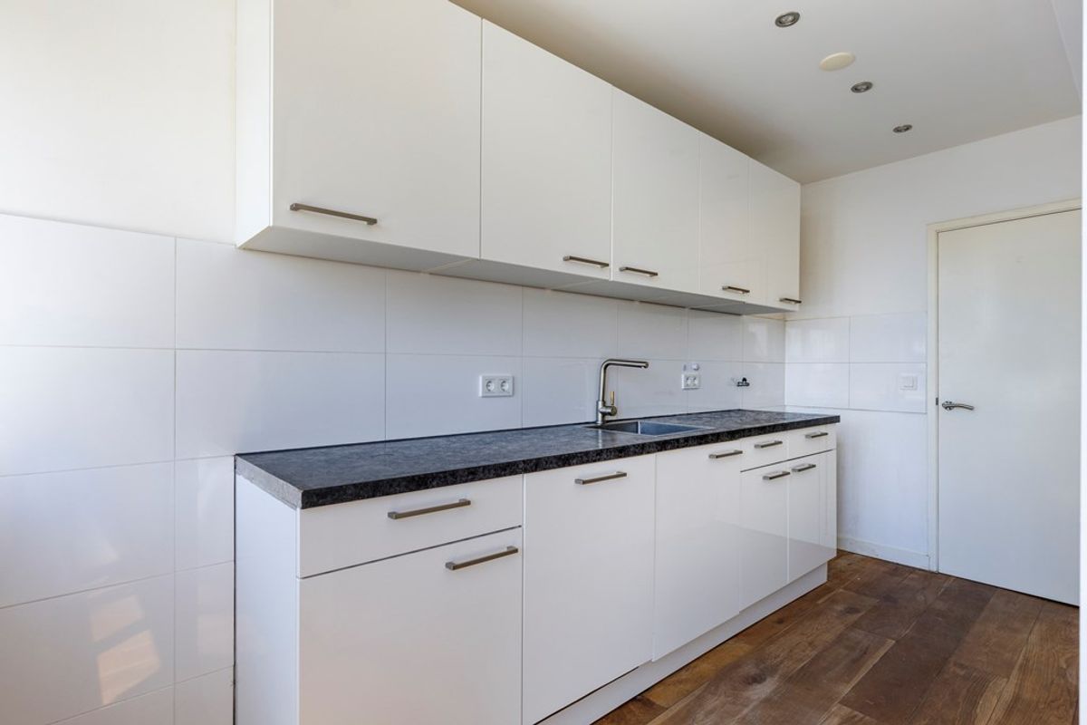 Aan de andere kant van het appartement vind je de gesloten keuken. Deze is functioneel ingedeeld, voorzien van een inbouwkookplaat en een vaatwasser, en biedt voldoende kastruimte om al je keukenspullen netjes op te bergen.