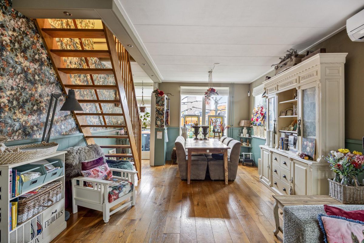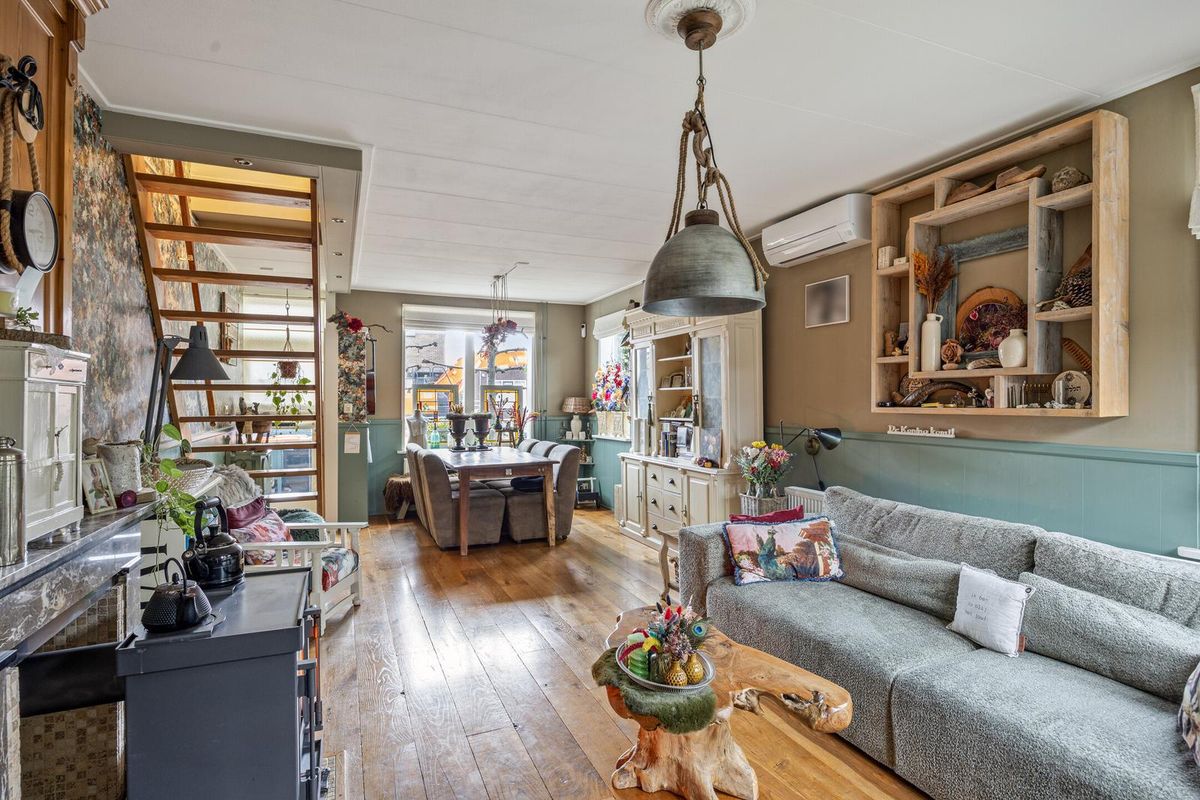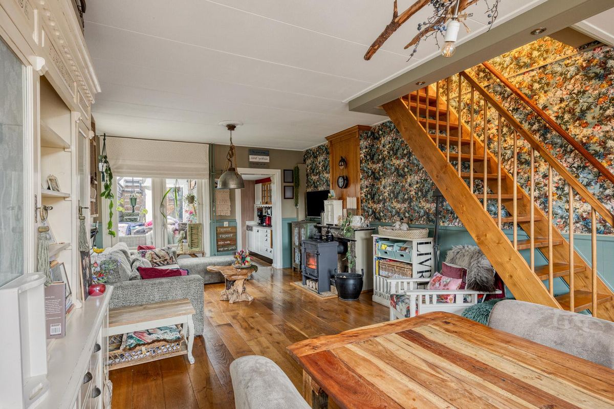 * Entree, royale living van ca. 31 m2 voorzien van houten vloerdelen, sfeervolle houtkachel, airconditioning (2024) en openslaande deuren naar de tuin.