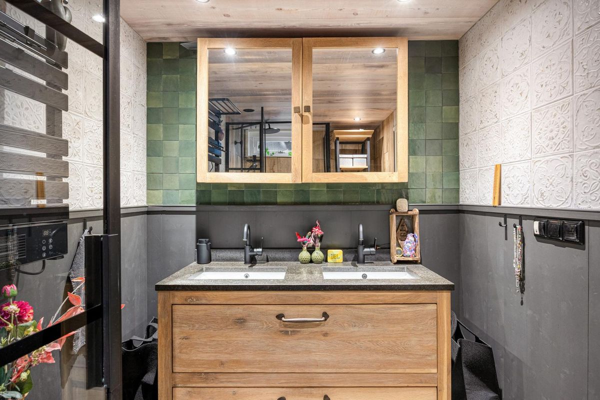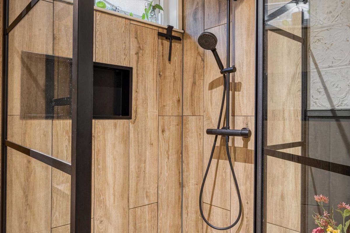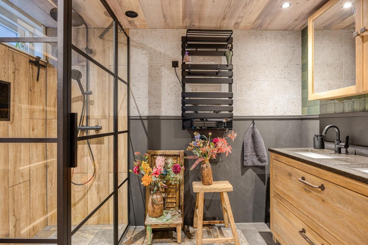 * Luxe badkamer (2024) van ca. 2.95 x 1.86 voorzien van ruime douchecabine, dubbele wastafel met Van Heck meubel en designradiator.