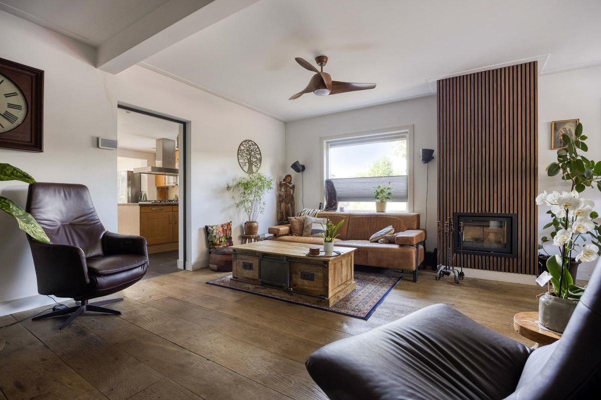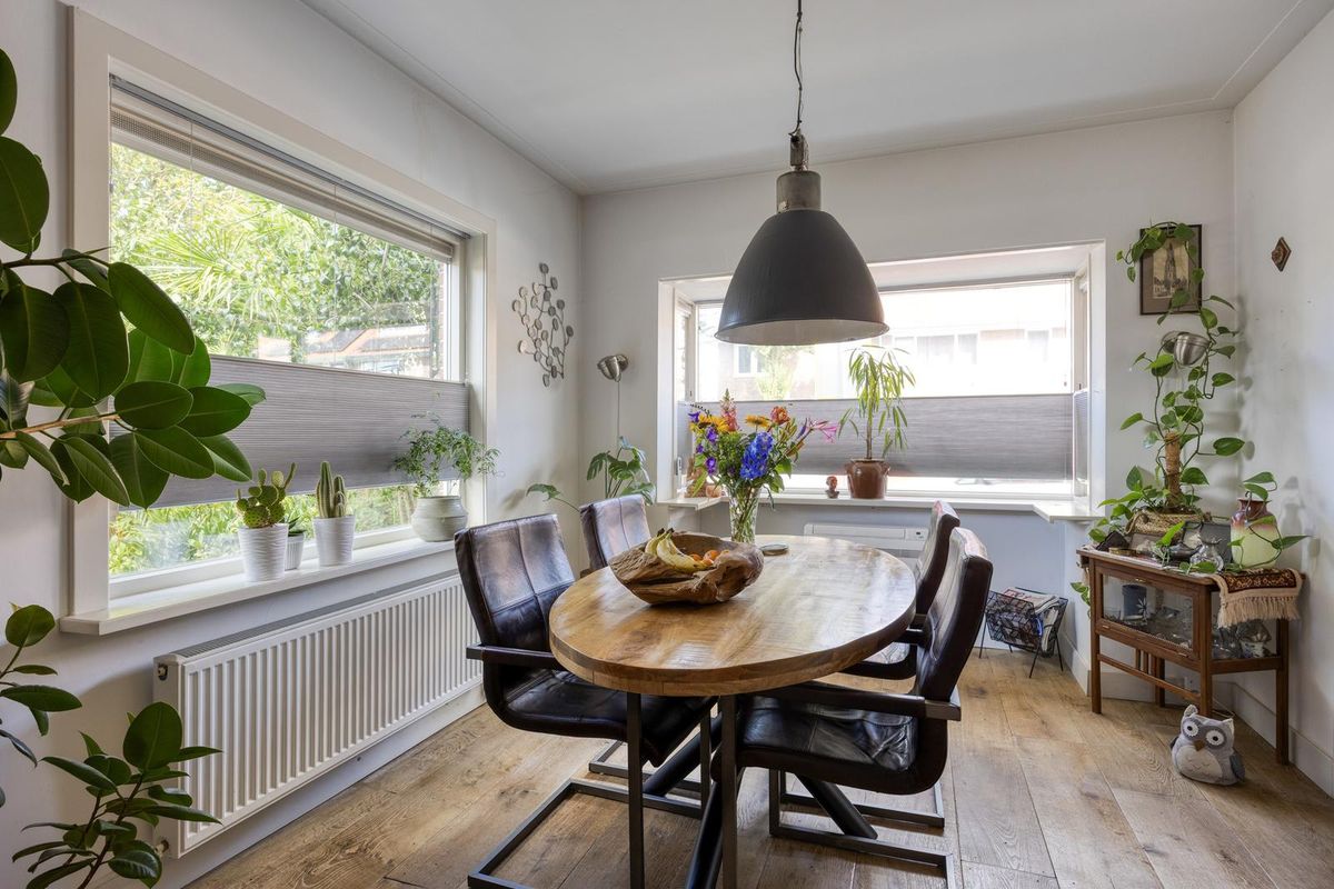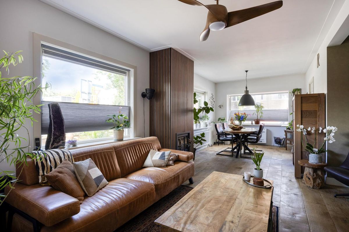 Via de hal, waar je de meterkast, het toilet en de trap naar boven aantreft, kom je binnen in de woonkamer. De fraaie parketvloer en de open haard (met nieuw rookkanaal) met houten omlijsting geven de ruimte een warme en sfeervolle uitstraling. Dankzij de erker aan de voorzijde en de ramen aan de zijkant valt er volop daglicht naar binnen. De woonkamer biedt plaats voor een royale zithoek en een eettafel, en er blijft zelfs nog voldoende ruimte over voor een aparte werk-, lees- of speelhoek.