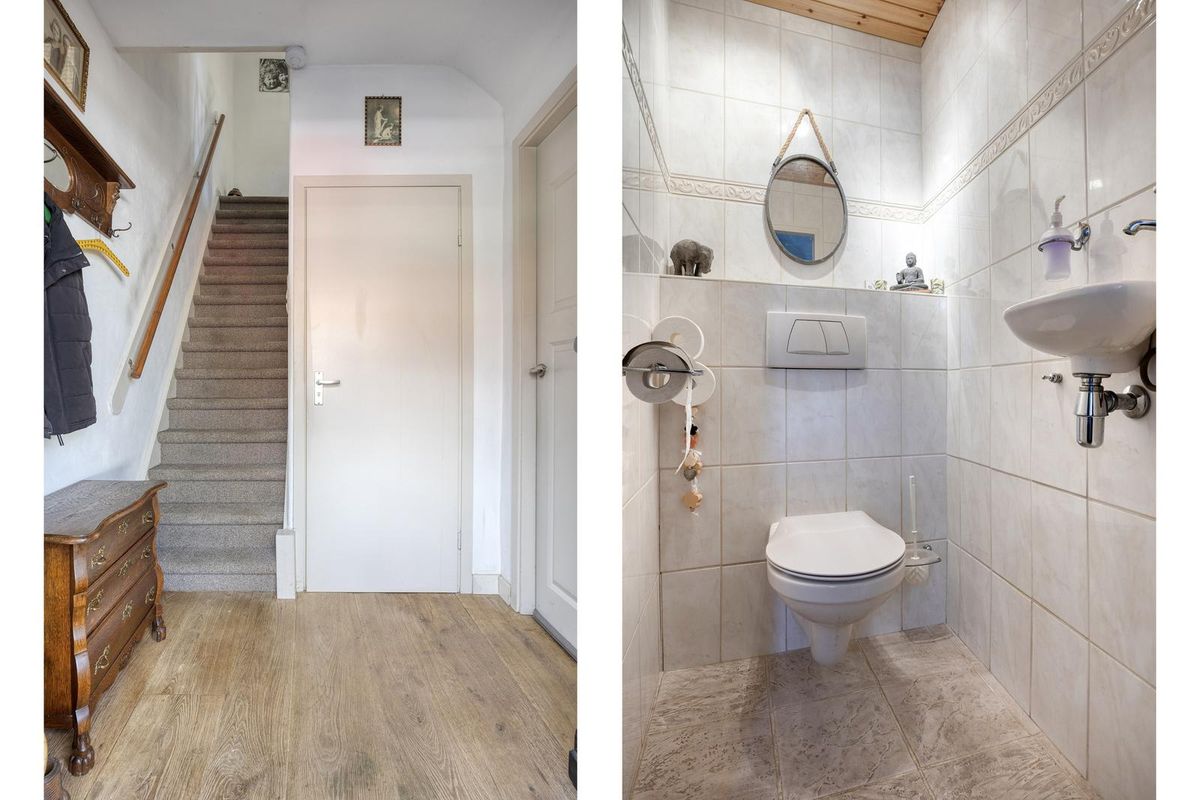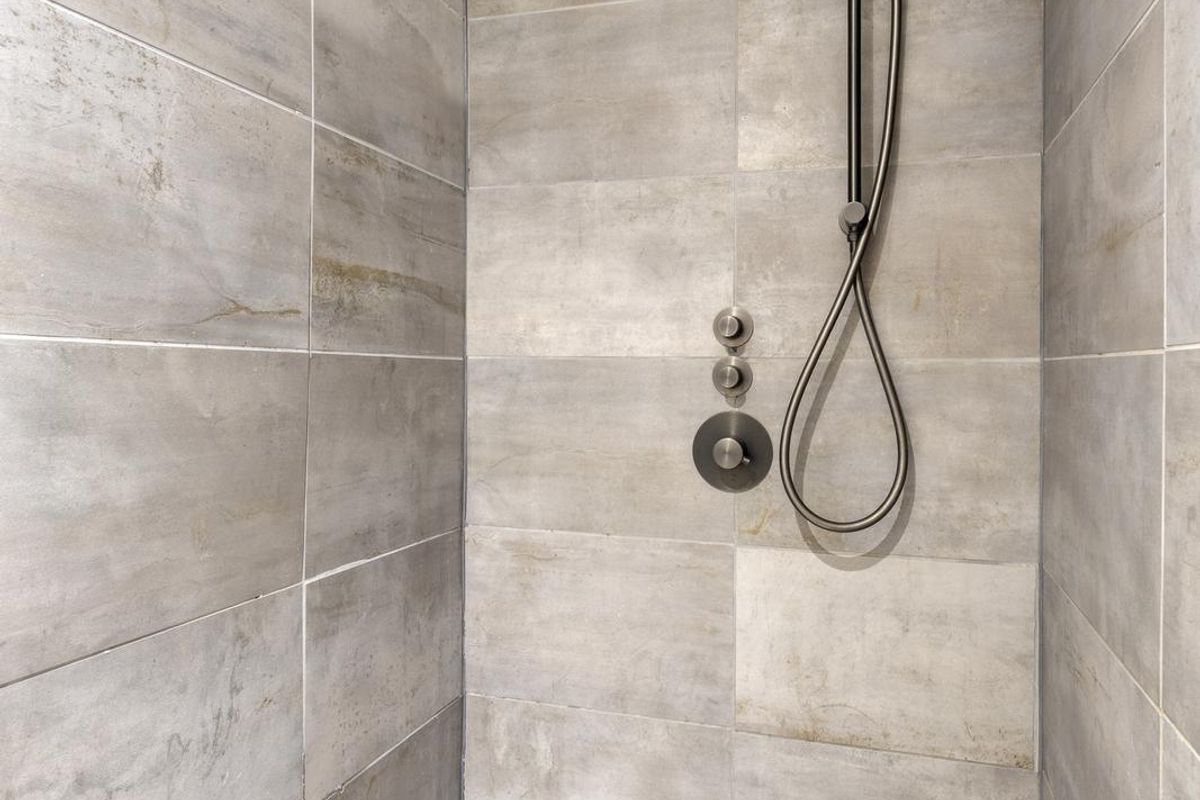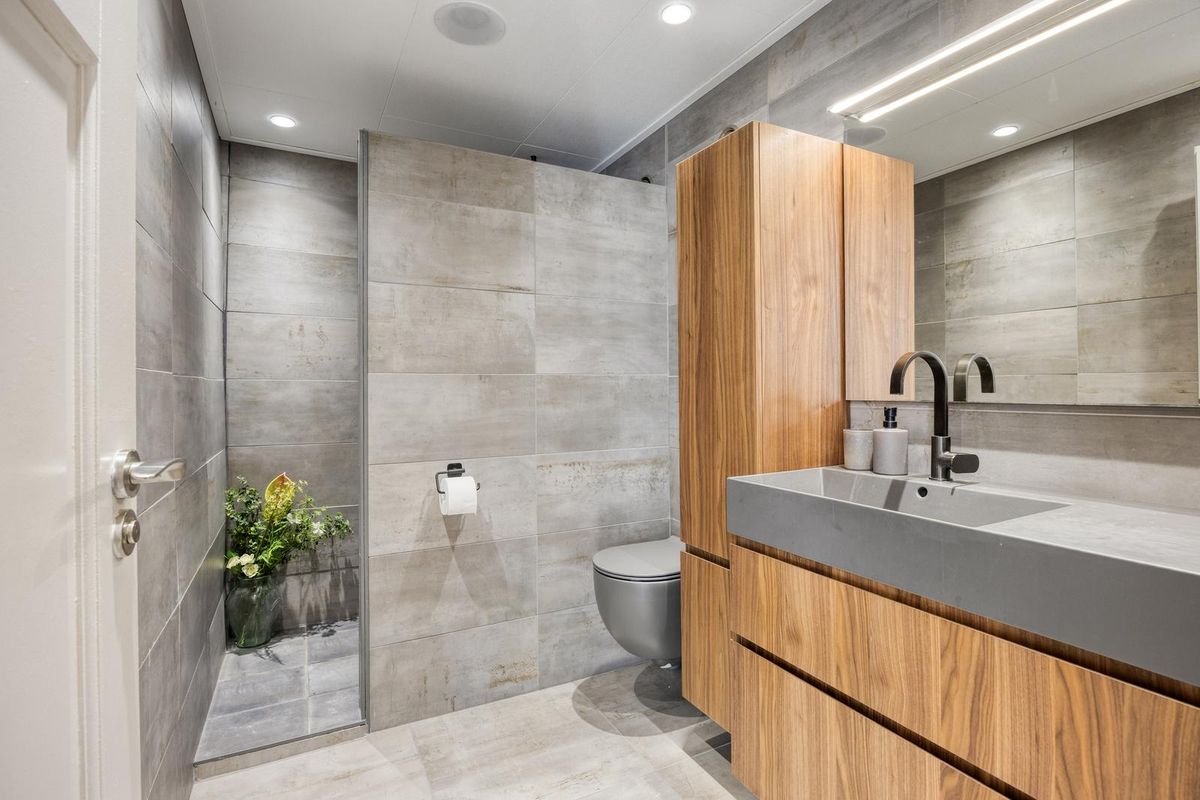 Aan de achterzijde is een praktische bijkeuken/berging met aansluitingen voor de wasmachine en droger. Via een kleine hal heb je toegang tot nog een berging met de cv-installatie en de badkamer. Deze luxe badkamer is in 2024 vernieuwd en uitgevoerd in moderne grijstinten gecombineerd met houtlook. De ruimte is volledig betegeld en voorzien van een tweede toilet, een wastafelmeubel en een inloopdouche.