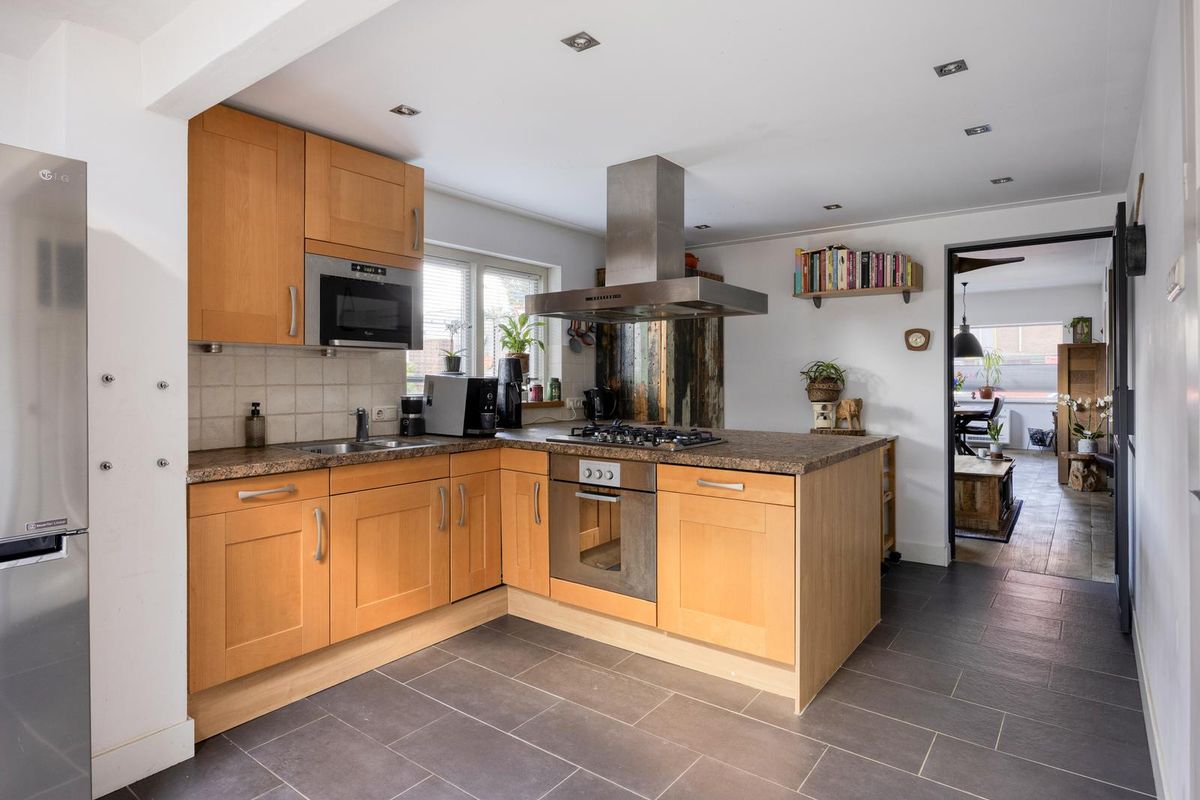 De keuken bevindt zich aan de achterzijde van de woning en is voorzien van een plavuizen vloer. Deze royale woonkeuken is opgesteld in een rechte lijn met een kookeiland, wat zorgt voor veel werk- en kastruimte. Uiteraard is de keuken uitgerust met de benodigde inbouwapparatuur. Er is voldoende plek voor een grote eettafel, ideaal om uitgebreid te tafelen met familie of vrienden. Dankzij de lichtkoepel en de openslaande deuren naar de tuin is dit een lichte en aangename ruimte. Zet de deuren open en laat binnen en buiten moeiteloos in elkaar overlopen.