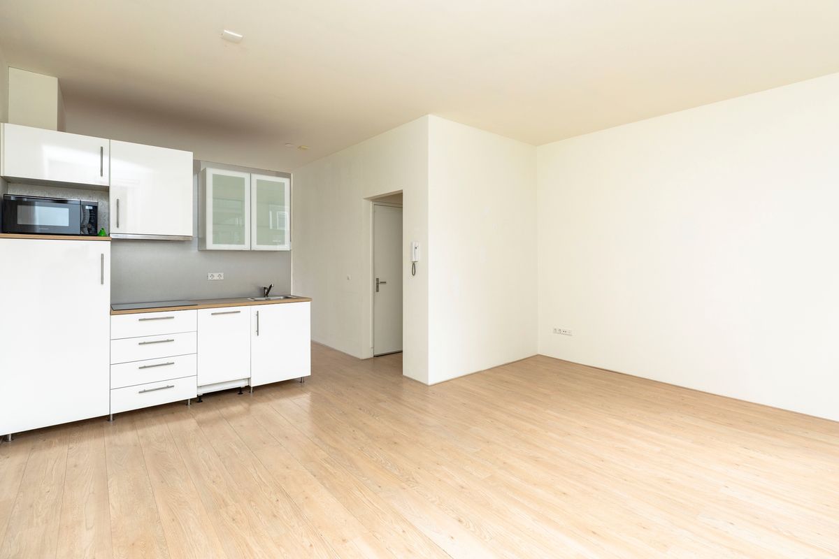 Centraal in de woning ligt de moderne keuken met strakke witte kasten en een doordachte indeling. De rechte wandopstelling is voorzien van inductieplaat, oven, koelkast, vaatwasser en mengkraan.