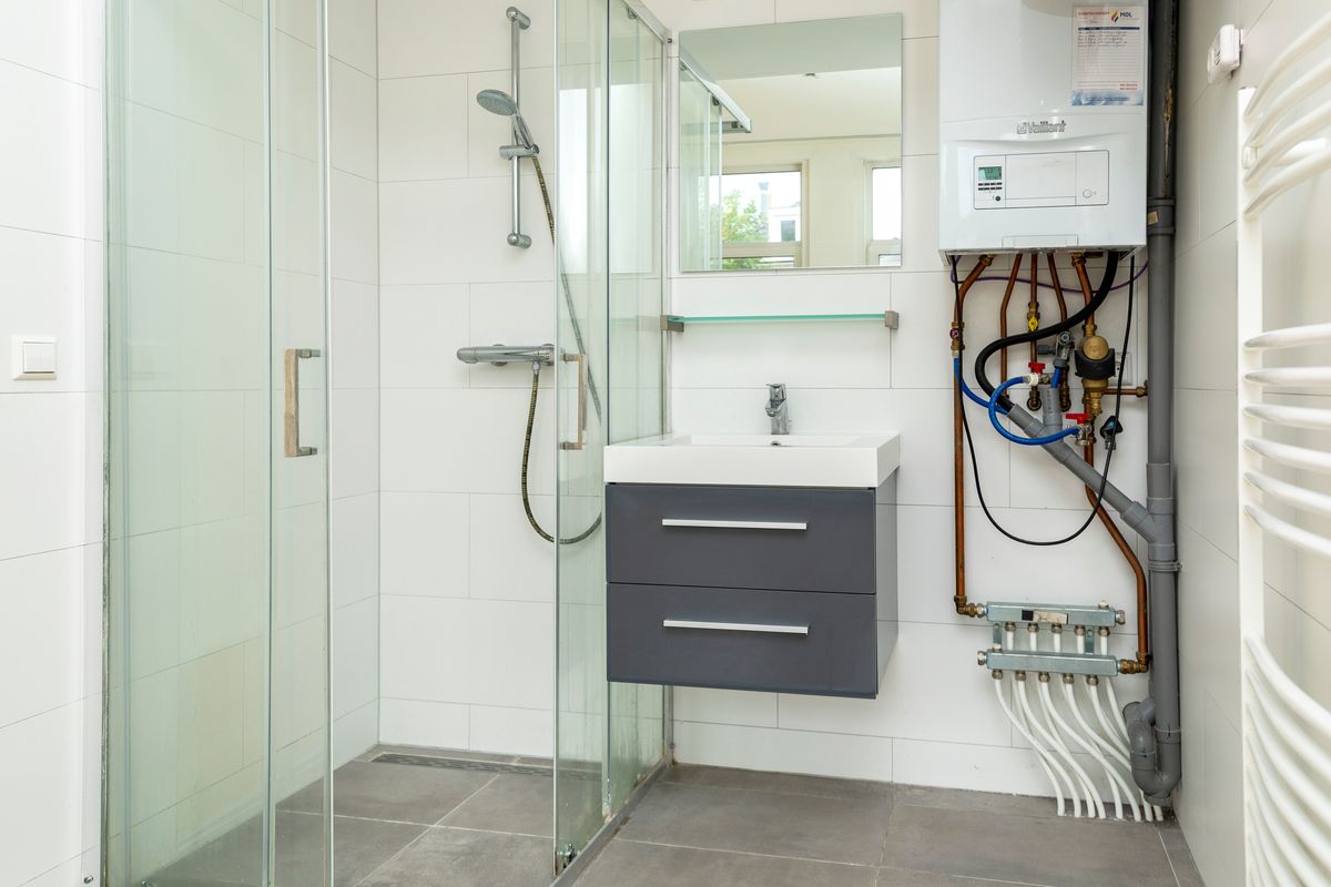 De badkamer is open. Een mooie, luxe ruimte die als een box in de kamer is geplaatst. Je vindt hier een riante inloopdouche met handdouche en een stijlvol wastafelmeubel. De vloer is betegeld met grote grijze tegels en de inbouwspot zorgt voor aangenaam licht. Het toilet is apart en is hetzelfde afgewerkt met grote grijze vloertegels en grote witte wandtegels.