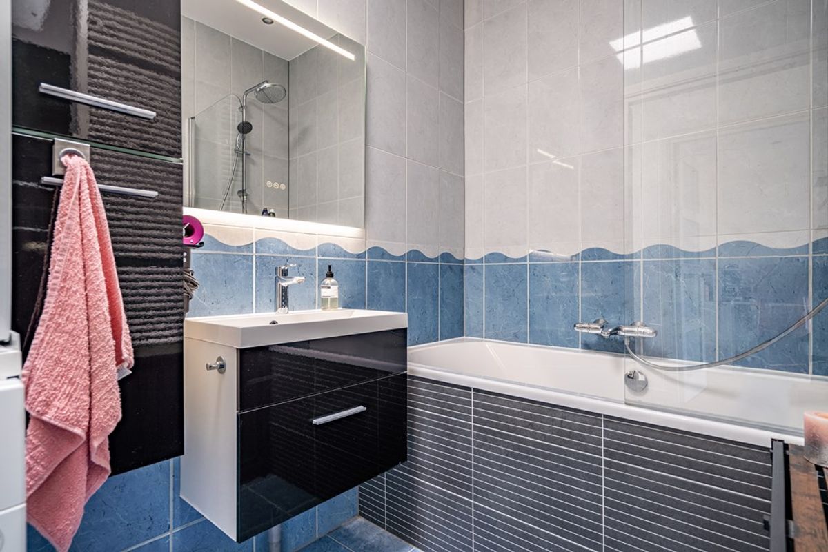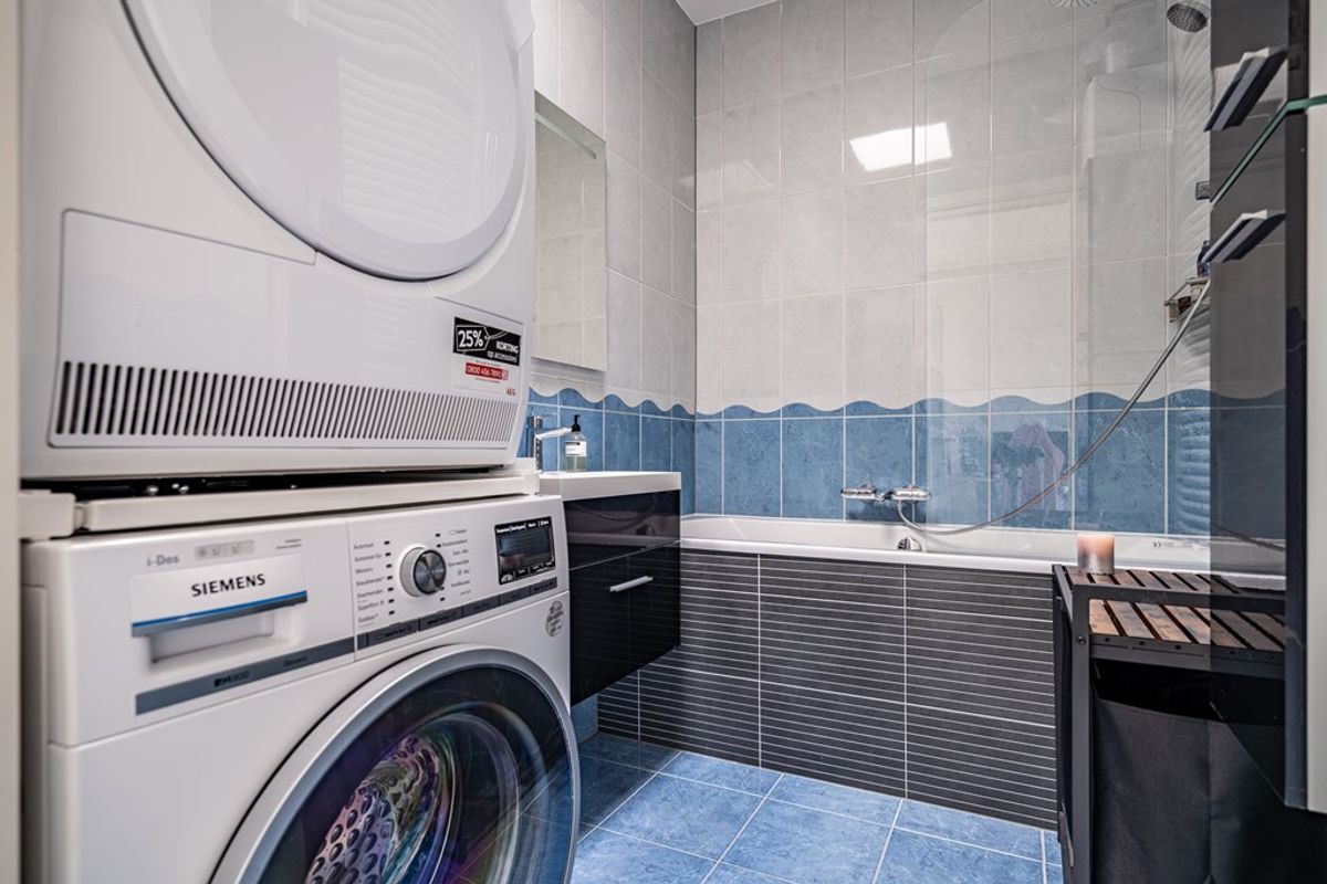 De badkamer is voorzien van een ligbad met douche, wastafel met spiegel en radiator. Hier bevinden zich tevens de aansluitingen voor de wasmachine en de CV-opstelling.