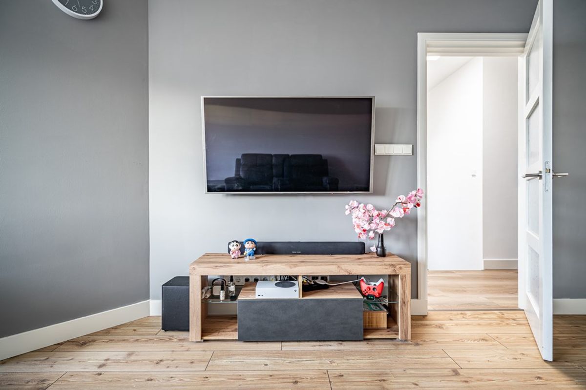 Via een open portiek bereikt u de entree van het appartement, waar een praktische opbergkast aanwezig is en de trap naar de woonverdieping. De hal geeft toegang tot alle vertrekken. Aan de voorzijde bevinden zich twee ruime slaapkamers. Aan de achterzijde liggen de woonkamer en de moderne, recent geplaatste keuken, uitgerust met diverse inbouwapparatuur: een 4-pits inductiekookplaat met afzuigkap, combimagnetron, vaatwasser en koel-vriescombinatie. Vanuit de keuken stapt u zo het zonnige balkon op, gelegen op het zuidwesten, waar u tot in de avond van het zonnetje kunt genieten.