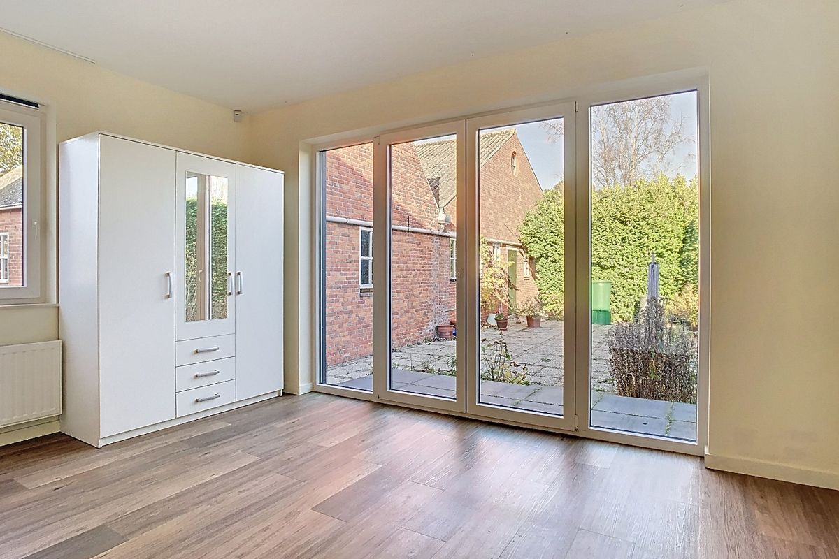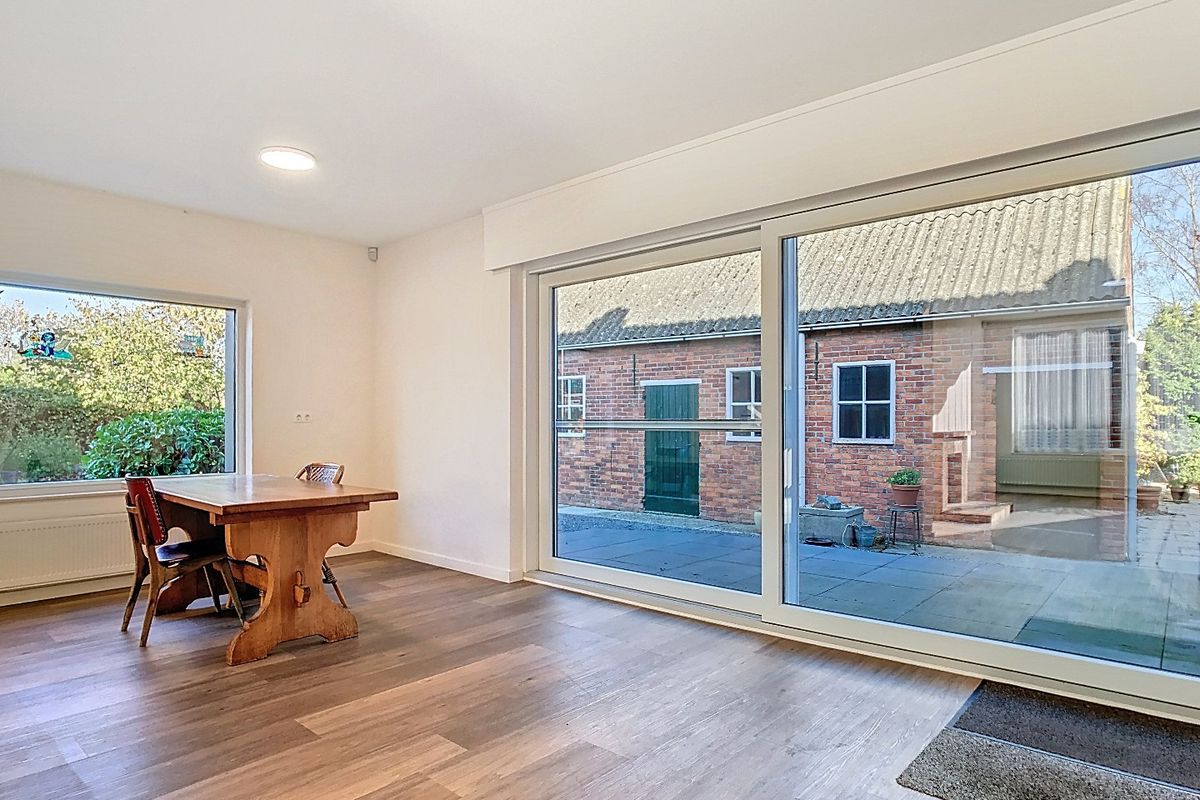 Bij aankomst valt direct de verzorgde voortuin en het landelijke karakter van het geheel op. Je betreedt de woning via de hal, die toegang biedt tot de lichte woonkamer en de eetkamer met een grote schuifpui naar het terras. Hier geniet je van volop daglicht en uitzicht op de tuin en het erf.