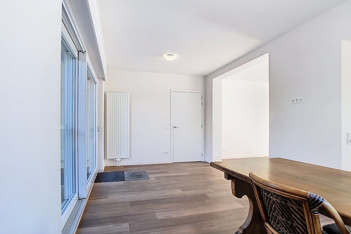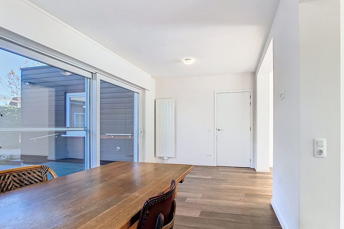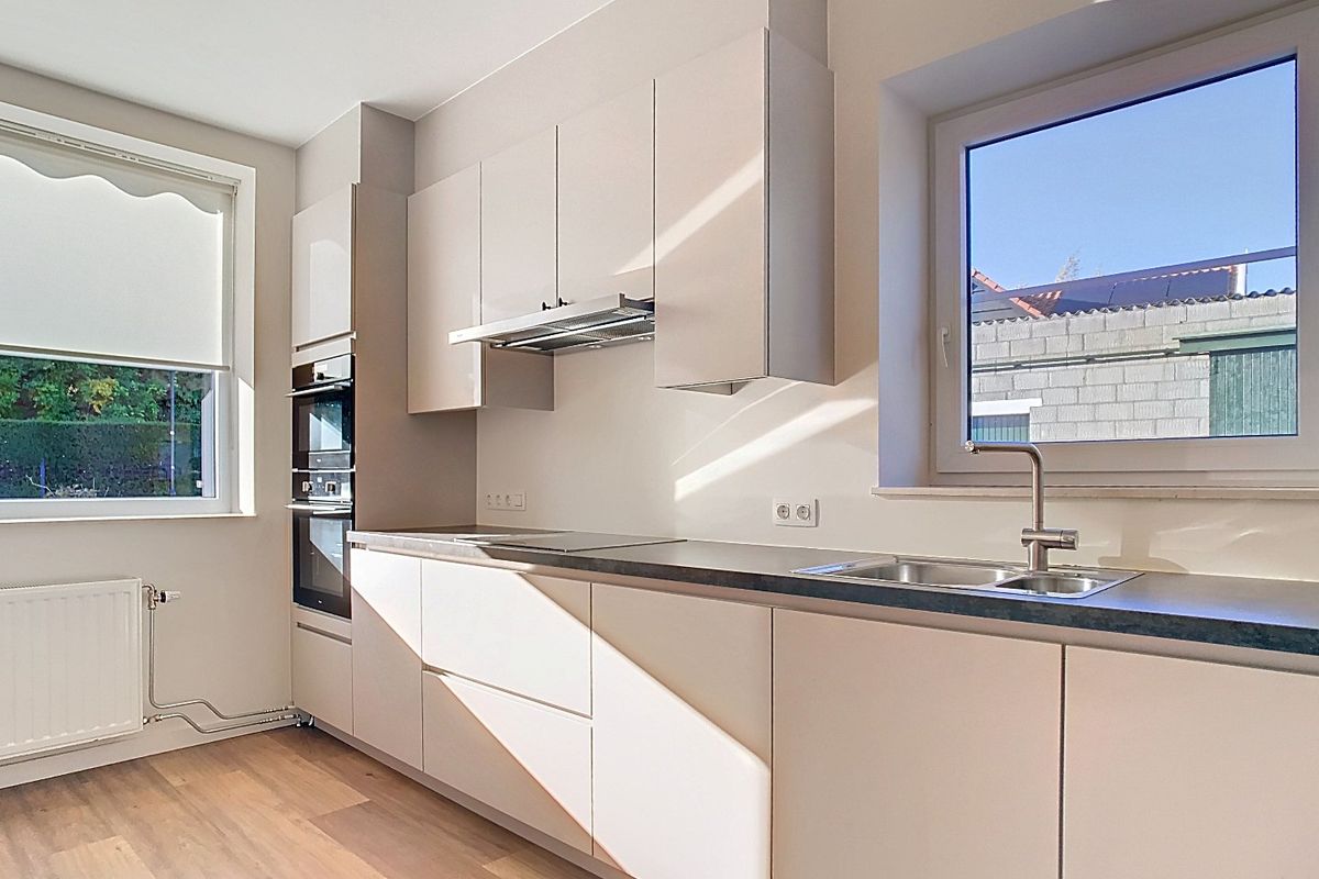 De moderne keuken, voorzien van inbouwapparatuur en voldoende werkruimte, sluit naadloos aan op de eetkamer. De rustige kleuren, strakke lijnen en natuurlijke lichtinval creëren een aangename, eigentijdse sfeer.
