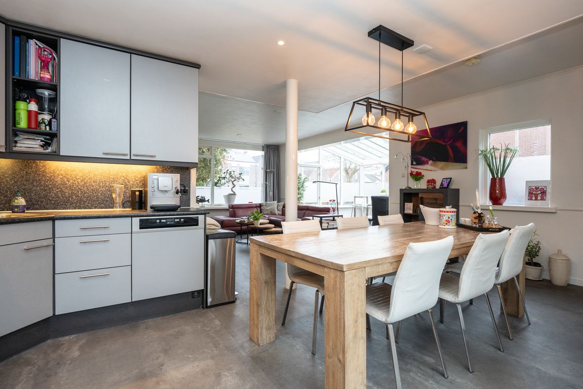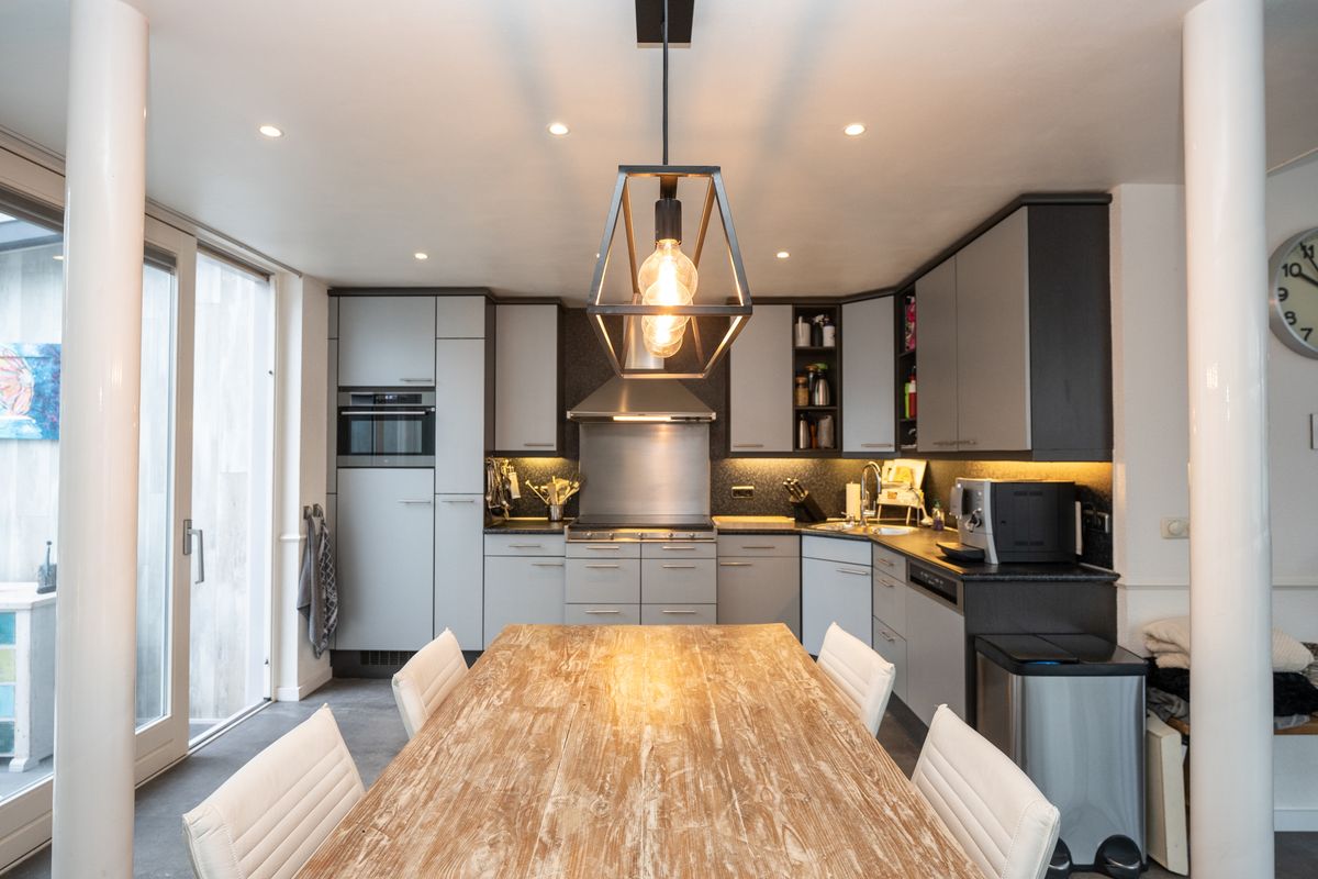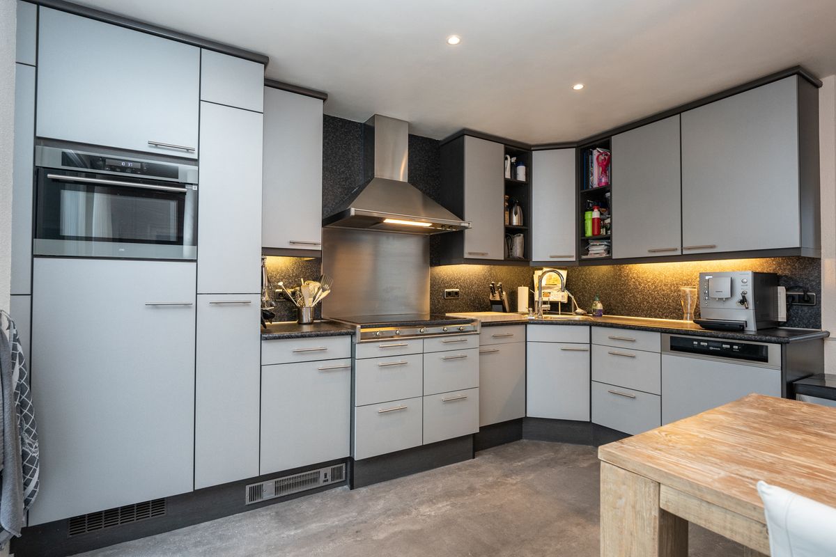 Aan de tuinzijde bevindt zich de complete en verzorgde hoekkeuken. Deze keuken is uitgerust met moderne inbouwapparatuur en luxe extra’s zoals een Quooker, alles ideaal voor de kookliefhebber.