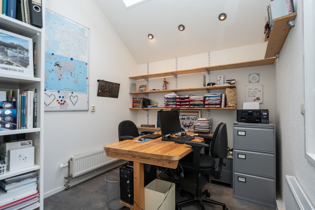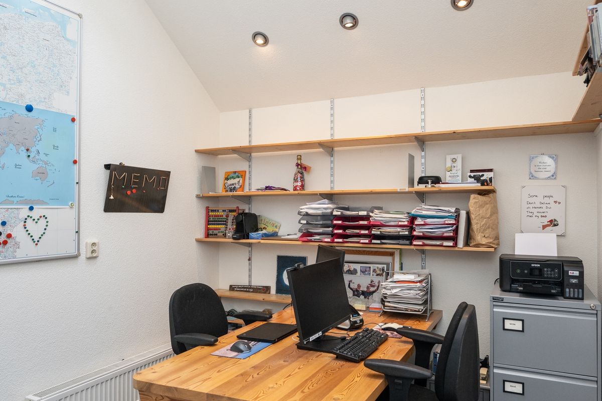 Vanuit de woonkamer bereik je tevens een veelzijdige kantoor-/hobbyruimte, ideaal als werkplek of bijvoorbeeld als speelkamer. In deze ruimte bevindt zich ook de toegang tot het toilet én een directe deur naar de tuin, wat het gebruiksgemak vergroot.