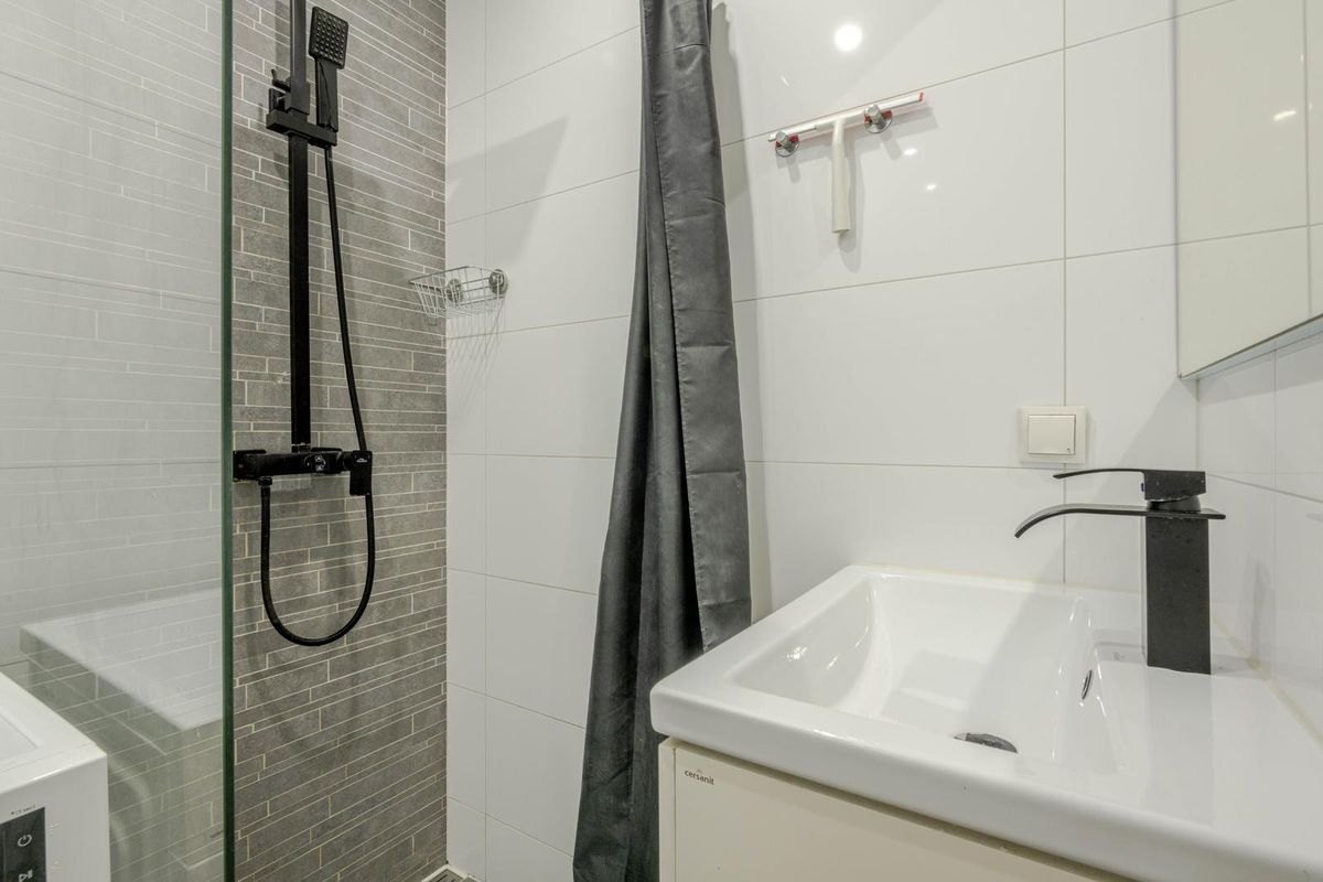 * Moderne badkamer, volledig betegeld en voorzien van wastafelmeubel, inloopdouche met regendouche en de wasmachine-aansluiting.