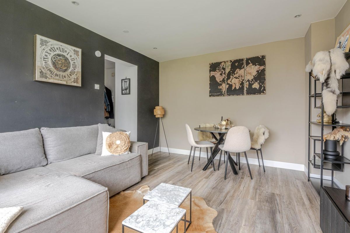 * Woonkamer voorzien van laminaatvloer, gestuukte wanden, plafond met inbouwspots en een deur naar het balkon.
