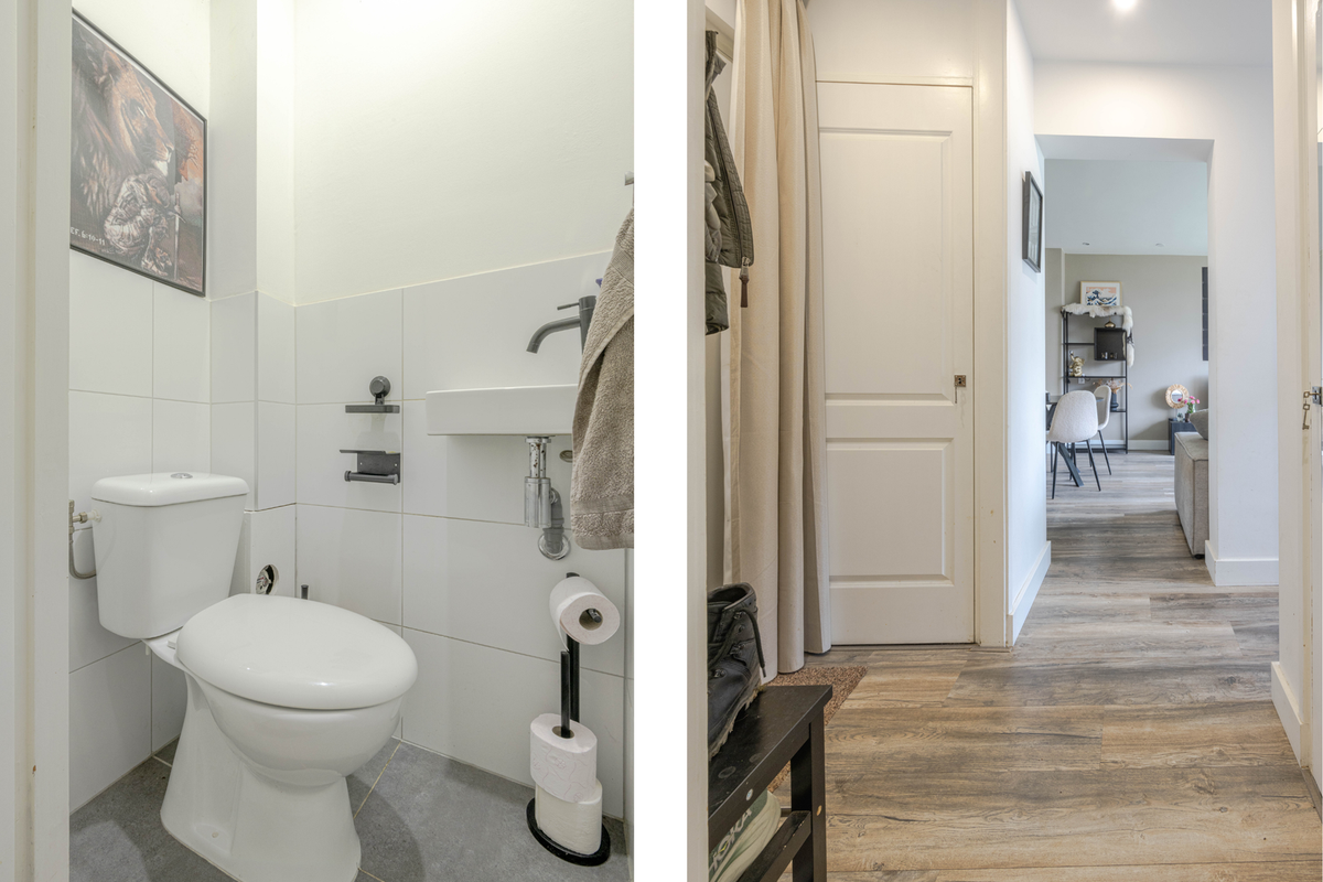 * Toiletruimte voorzien van duoblok-toiletopstelling, fonteintje en nette betegeling.