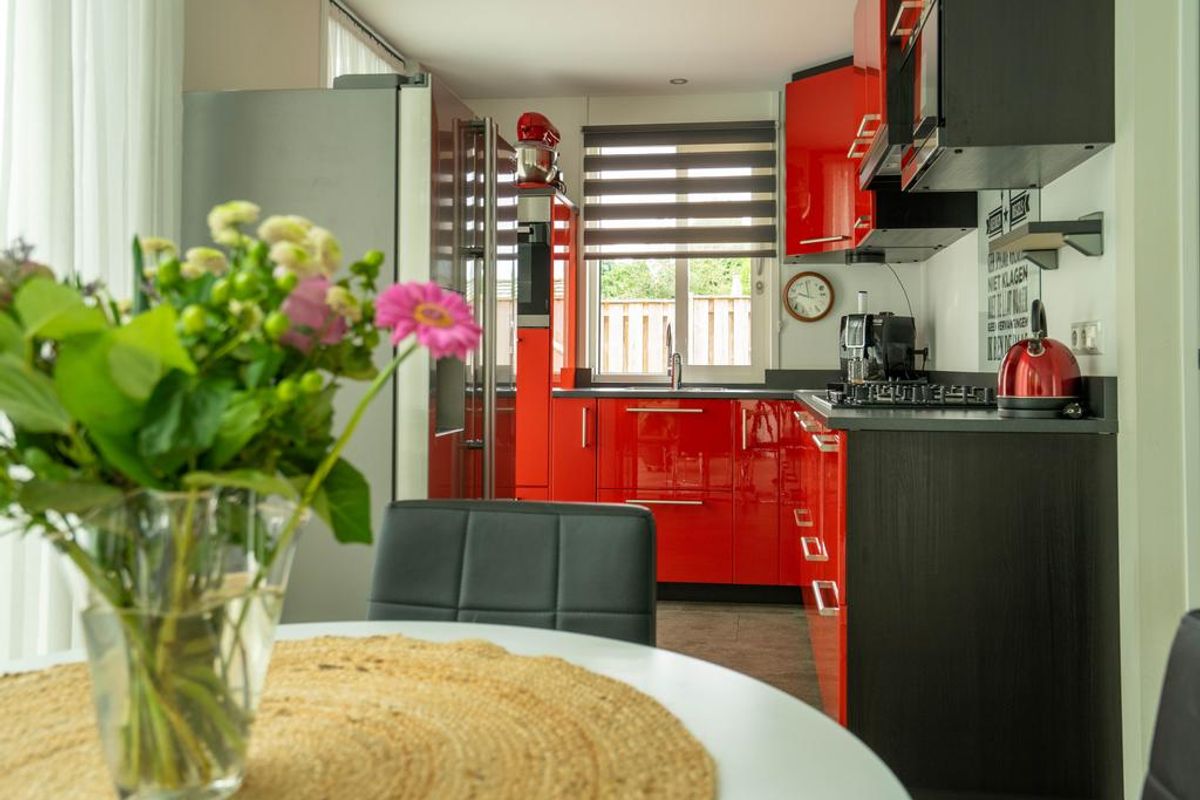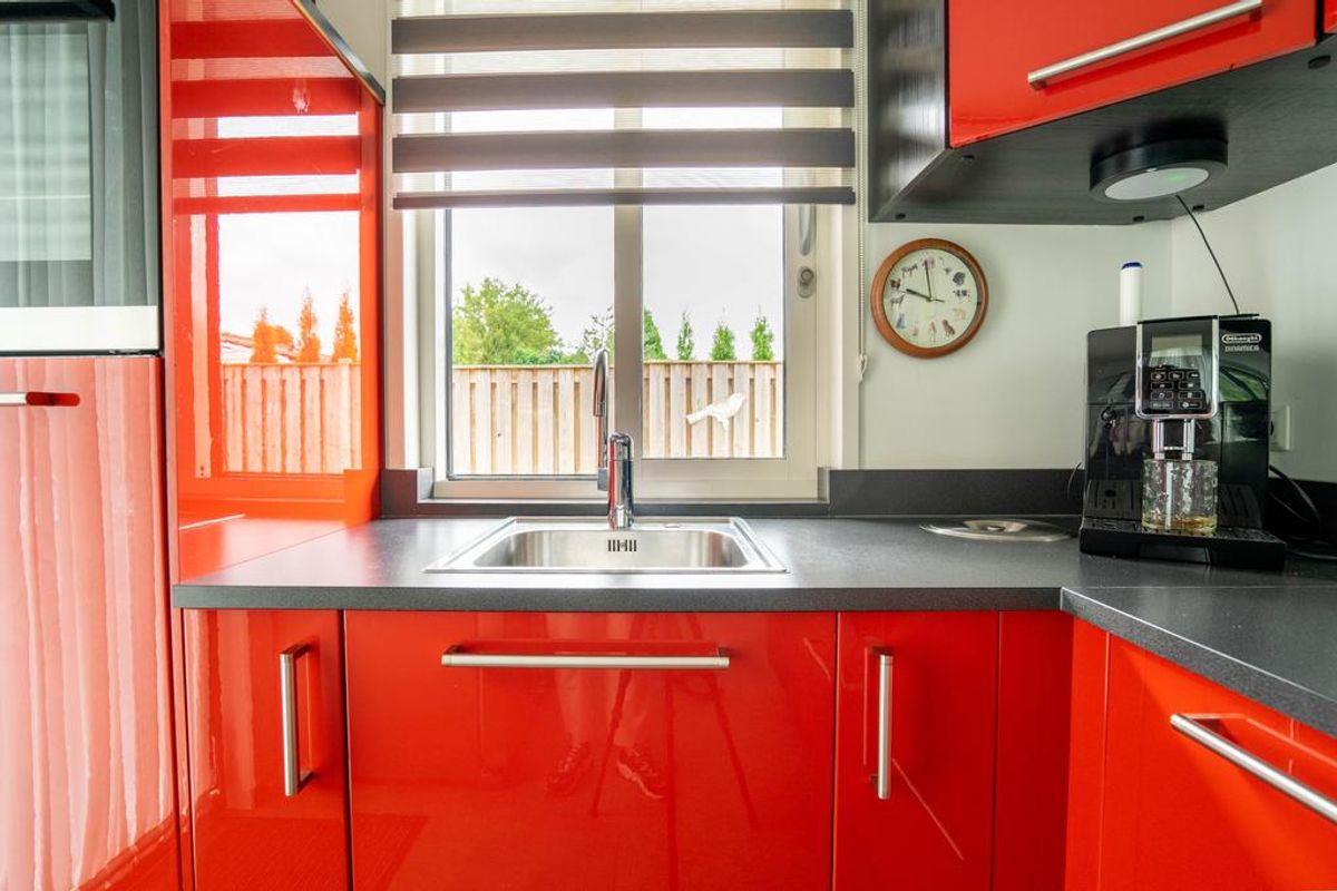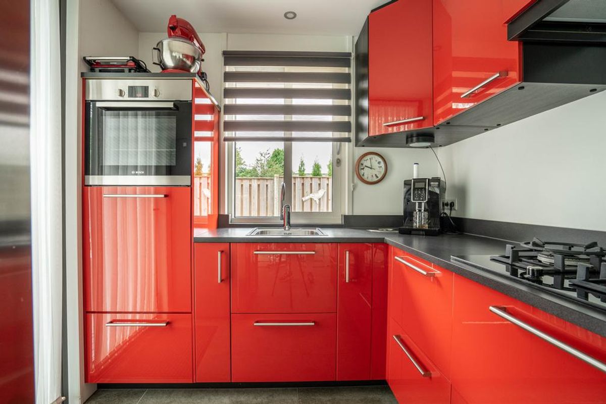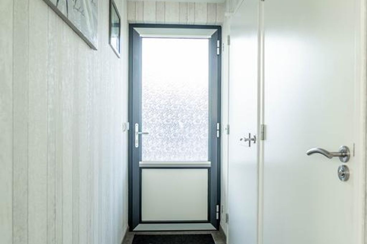 Ook de keuken is voorzien van volop lichtinval middels een raampartij en loopdeur welke voorzien is van glas.