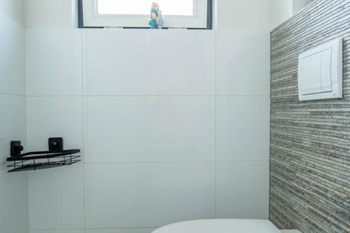 Het toilet is voorzien van hangreservoir , het kip raam zorgt hier voor de natuurlijke ventilatie. Ook deze ruimte is strak afgewerkt met tegels tot +/- 1.20 m hoog. Verder zijn de wanden uitgevoerd in strak stukwerk.
