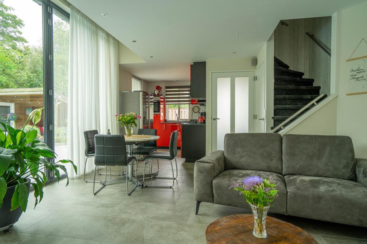 De woonkamer beschikt over volop lichtinval middels diverse raampartijen, loopdeur en openslaande harmonica deuren naar de fraaie achtertuin. De woonkamer staat in open verbinding met de keuken.