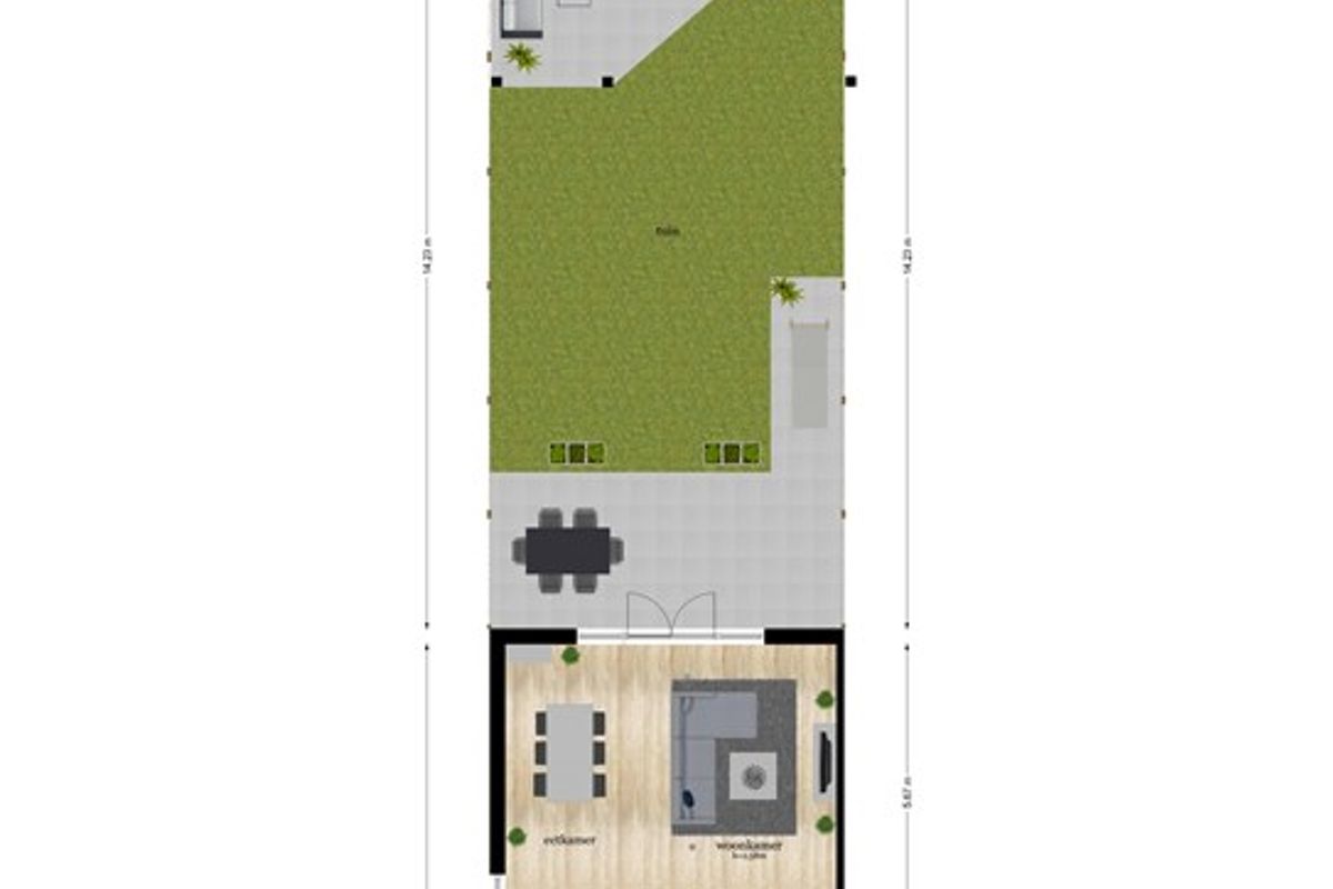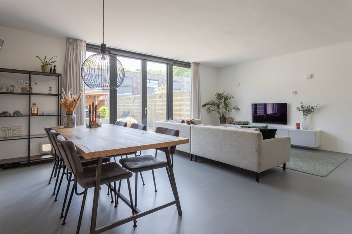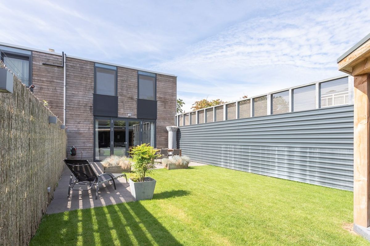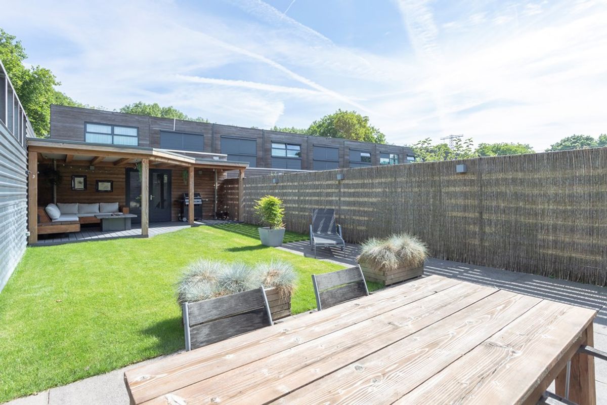 Aan de achterzijde is de fijne, diepe achtertuin gesitueerd. Deze is afgewerkt met een fraai betegeld terras, strak gazon en een terrasoverkapping (ca. 20 m²).