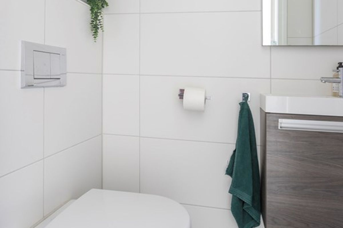 De geheel betegelde badkamer is voorzien van een ruim ligbad, inloopdouche, hangtoilet en een wastafel in badkamermeubel.