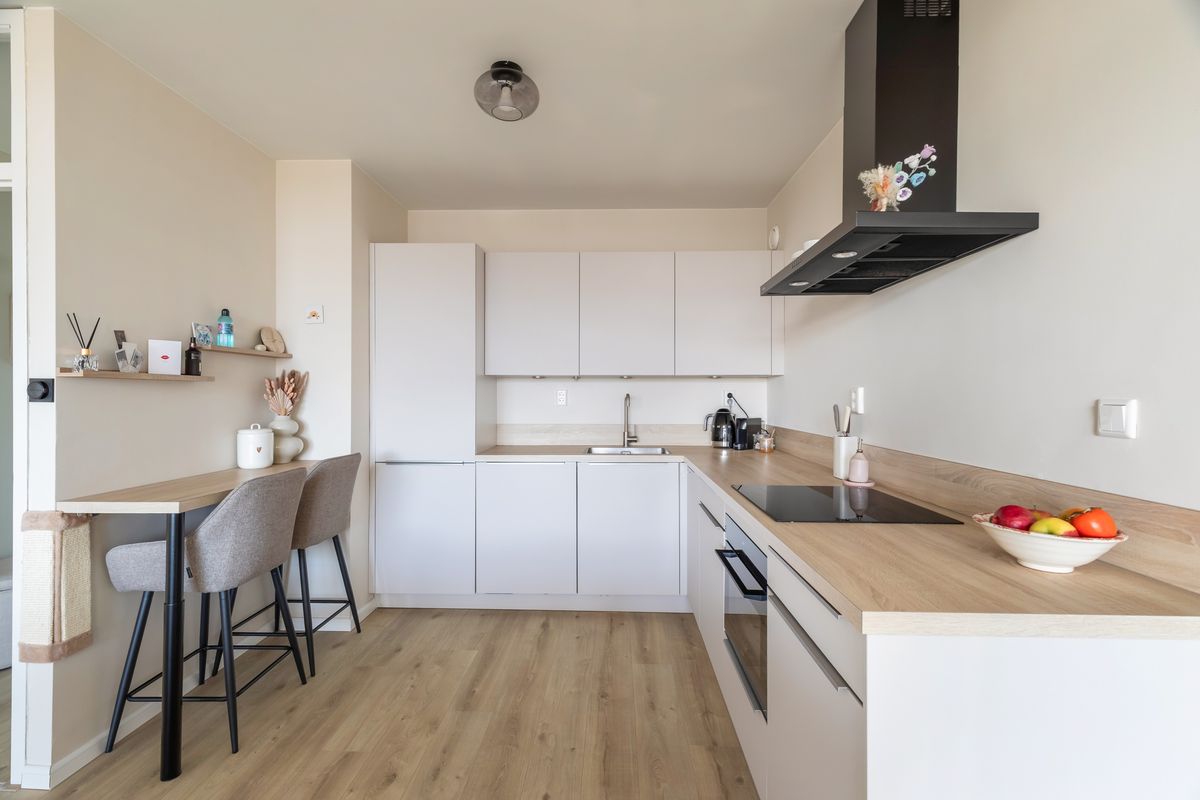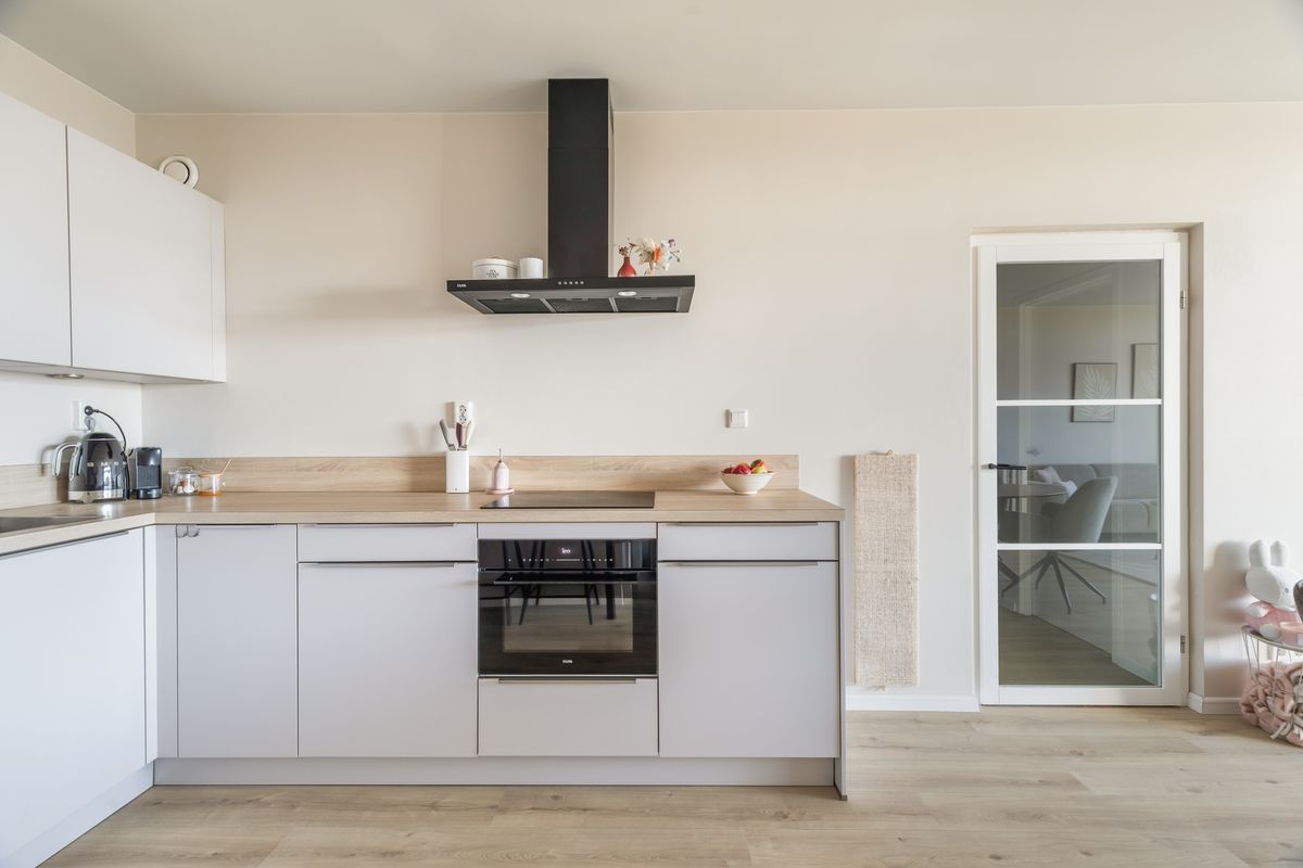 Voor wie graag kookt (of gewoon houdt van een stijlvolle keuken) is dit echt genieten. De frisse mat witte kasten en het eiken werkblad vormen een tijdloze combinatie en alle apparatuur is nieuw. Inductiekoken? Geen probleem — dankzij de nieuwe groepenkast is alles perfect voorbereid. Het is zo’n keuken waar je moeiteloos een kop thee zet, maar net zo makkelijk een uitgebreide maaltijd kookt voor familie of vrienden.
