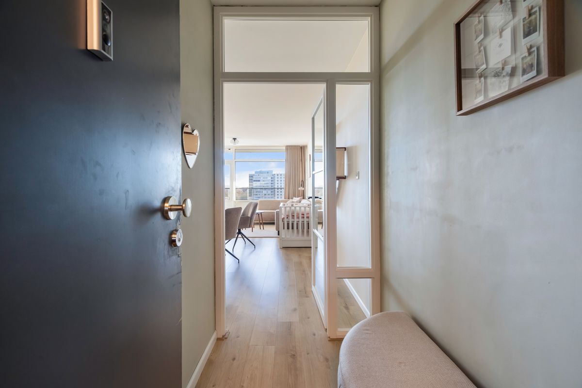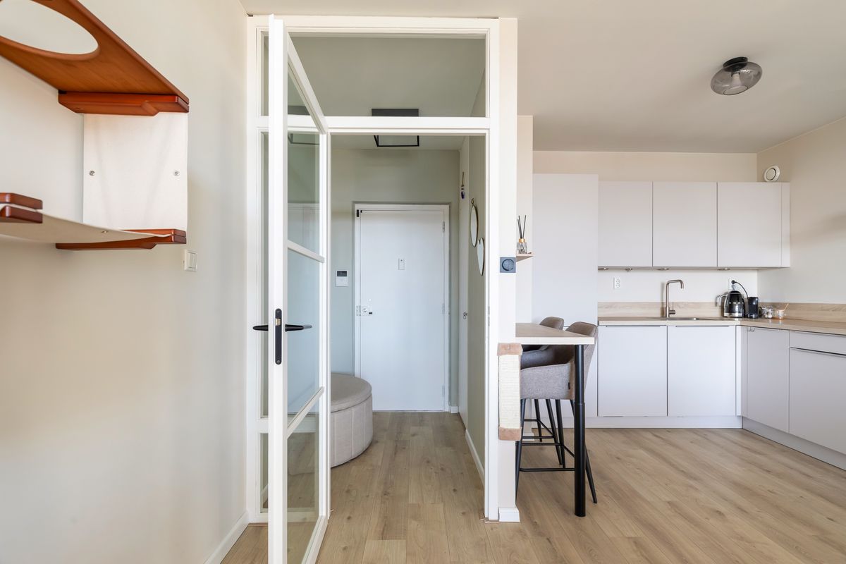 In de tussenhal ontdek je meteen hoe doordacht deze woning is. De vaste kasten bieden ruimte voor wasmachine en droger. Alle binnendeuren zijn overigens vervangen door strakke witte exemplaren voorzien van zwarte handgrepen, waarvan 2 stuks met een lichte industriële touch. Het zijn die kleine details die dit appartement een moderne uitstraling geven.