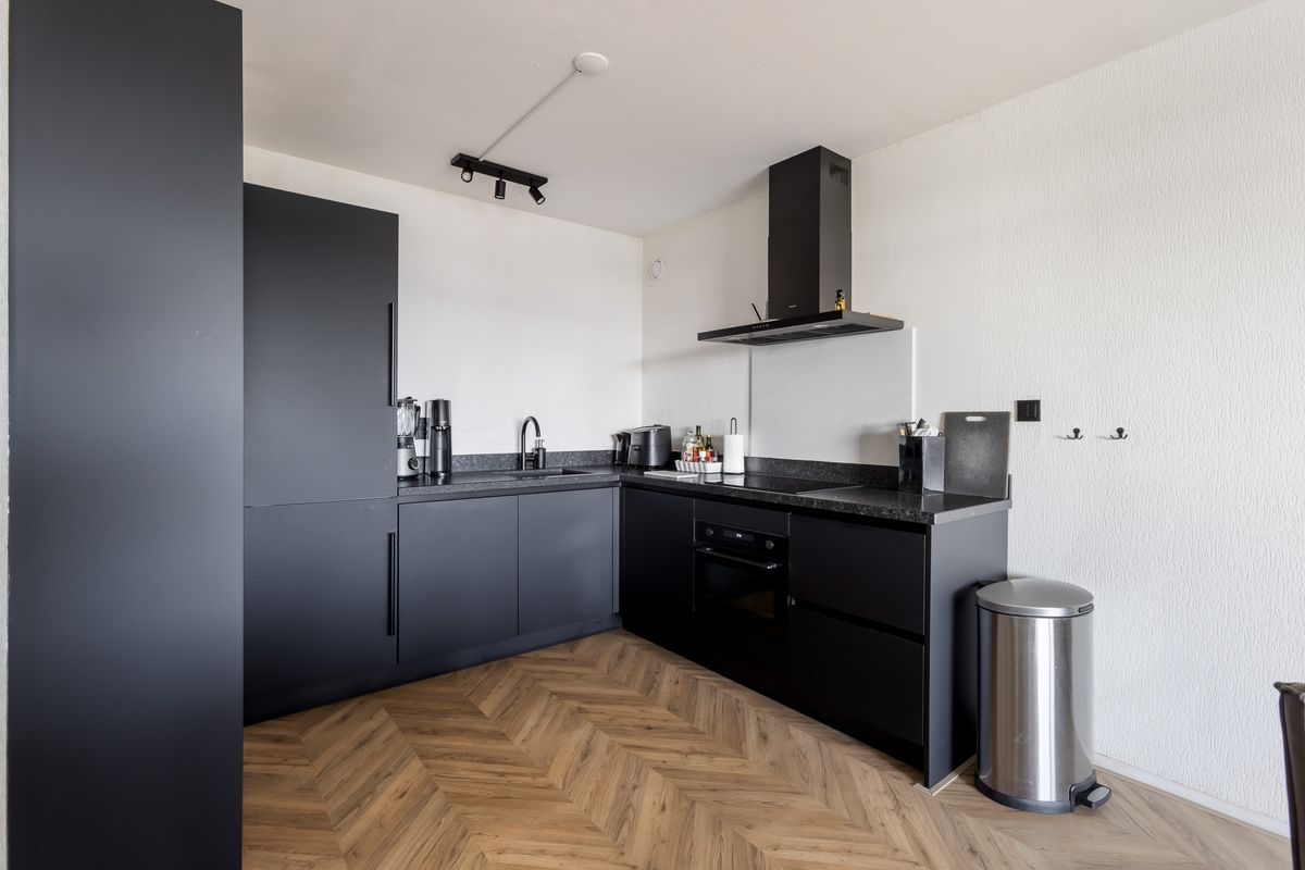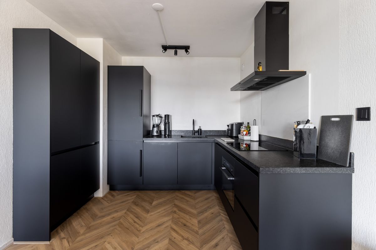 - Keuken (1.59 x 2.97m): Open L-vormige keuken mat zwarte keuken voorzien van een (combi)oven en vaatwasser, inductiekookplaat met afzuiging, koelkast en vriezer.