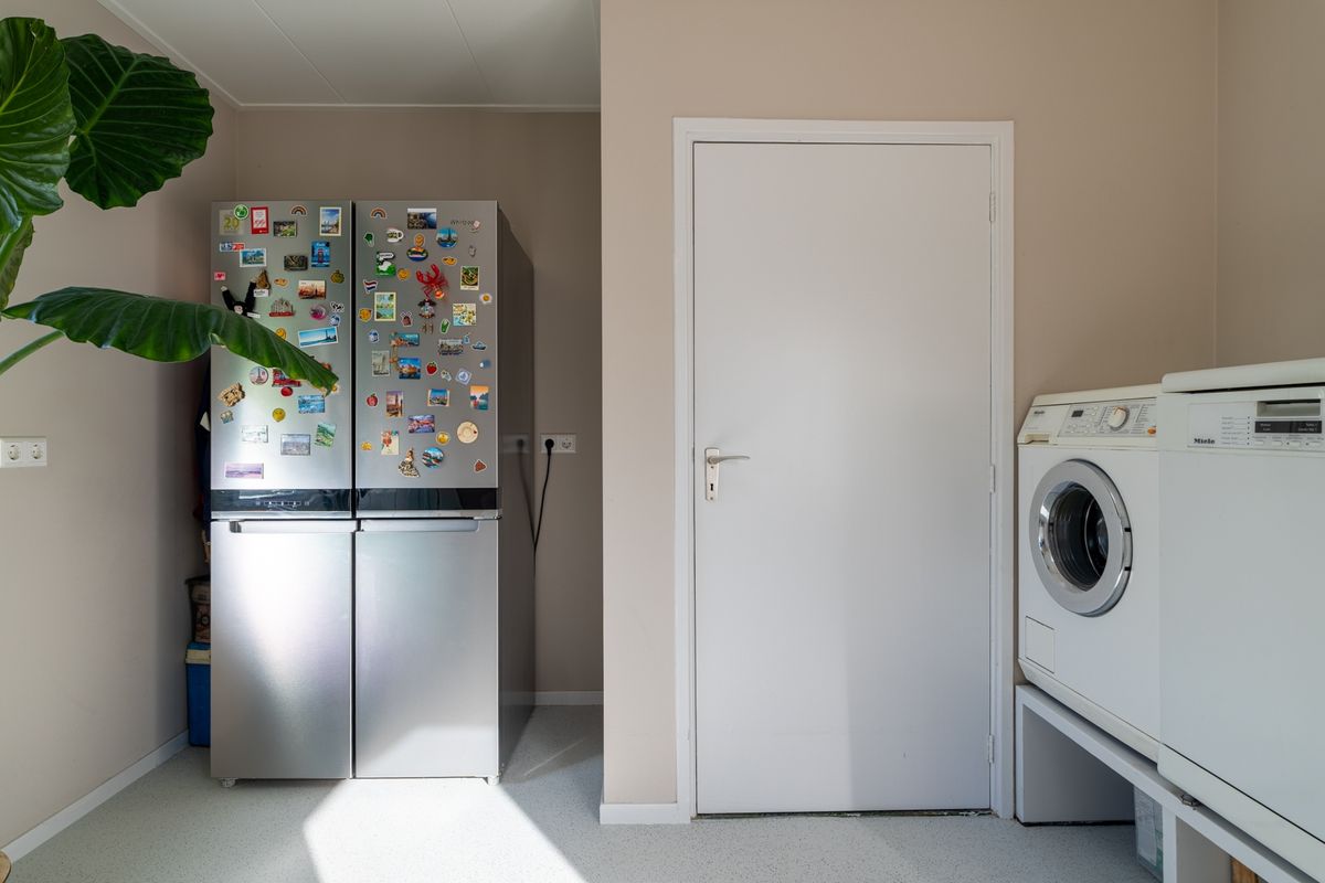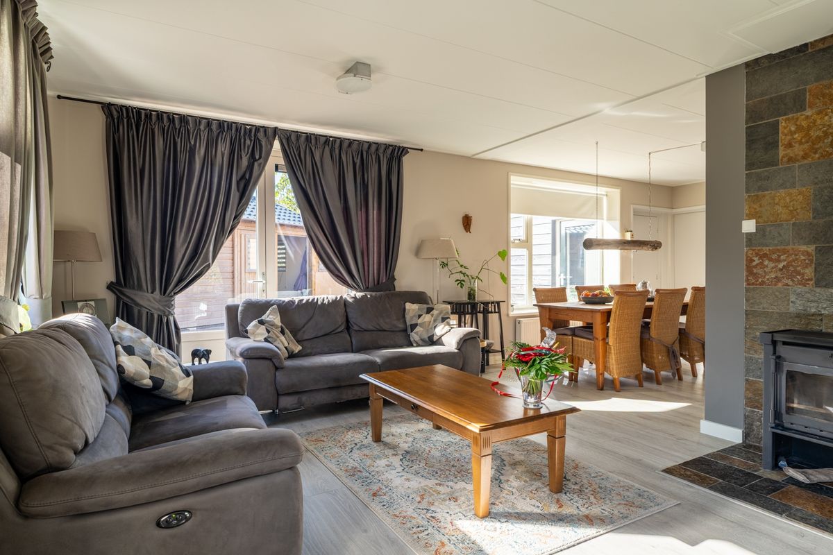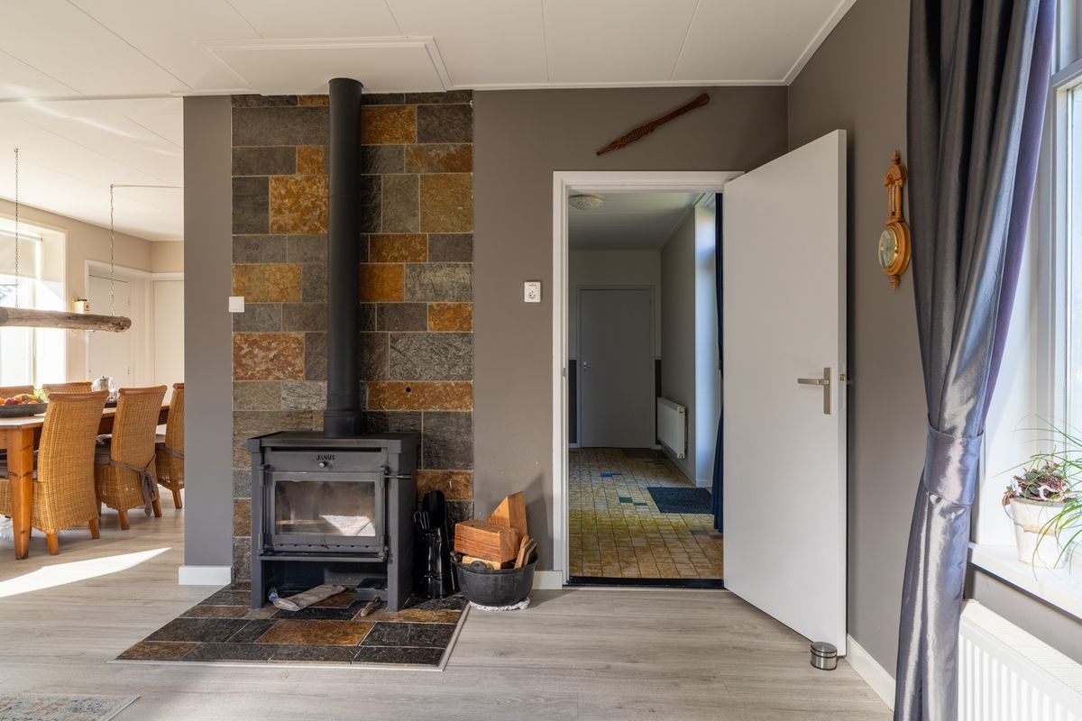 De woonkamer en keuken vormen samen een gezellige L-vormige leefruimte. Dankzij de grote ramen en openslaande tuindeuren is het hier heerlijk licht. De houtkachel zorgt voor extra sfeer op koude dagen. De keuken heeft een rustige houtlook met een natuursteenlook werkblad en is uitgerust met o.a. een inductiekookplaat, combimagnetron en afzuigkap. In de bijkeuken vind je extra bergruimte en plek voor wasmachine en droger – praktisch én uit het zicht.