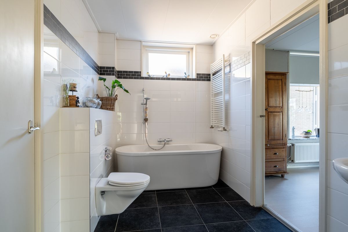 Badkamer beneden: ligbad, toilet, wastafel.