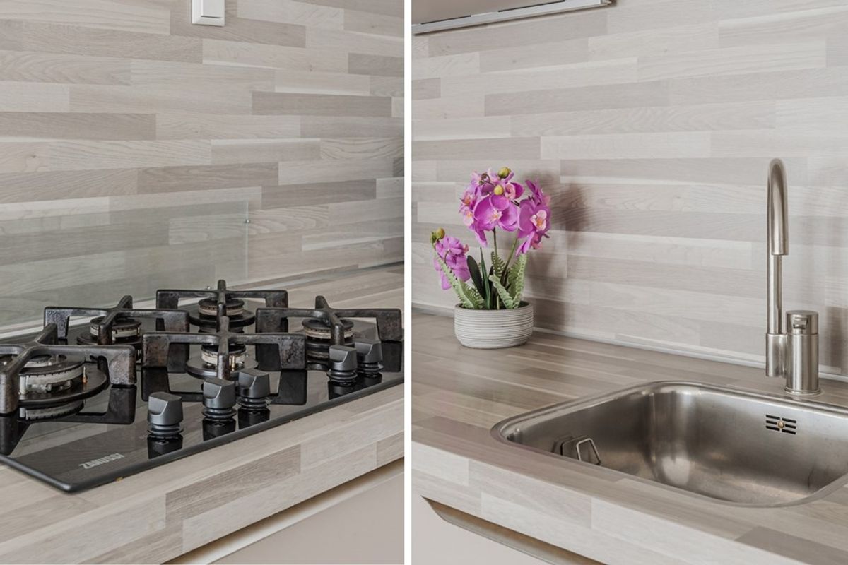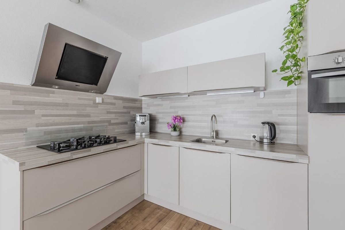 Aangrenzend aan de woonkamer is de moderne strakke open keuken gelegen. De keuken is voorzien van diverse inbouwapparatuur zoals o.a. een oven / combi-magnetron, vaatwasmachine en een gaskookplaat met design afzuiging en een schiereiland waaraan ook gegeten kan worden.