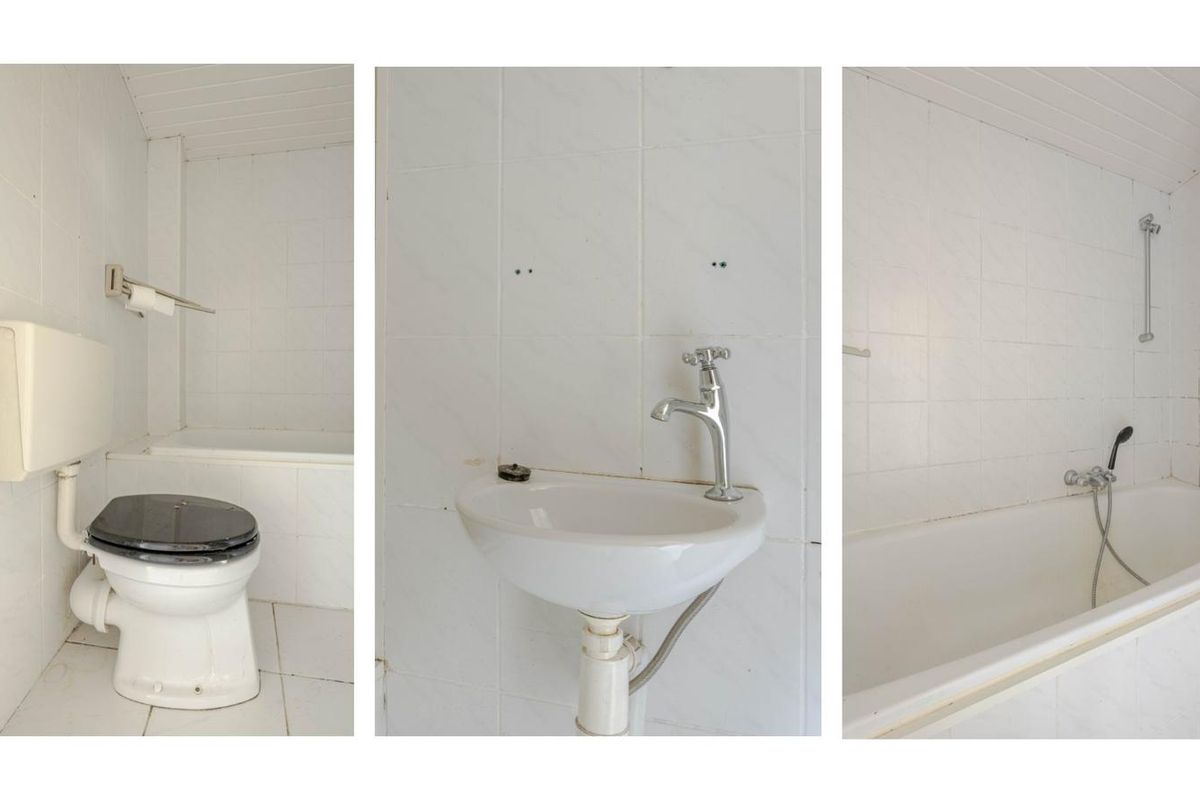 * Badkamer, geheel licht betegeld, voorzien van schrootjesplafond, fonteintje, ligbad met douche-opstelling en duoblok-toiletopstelling.